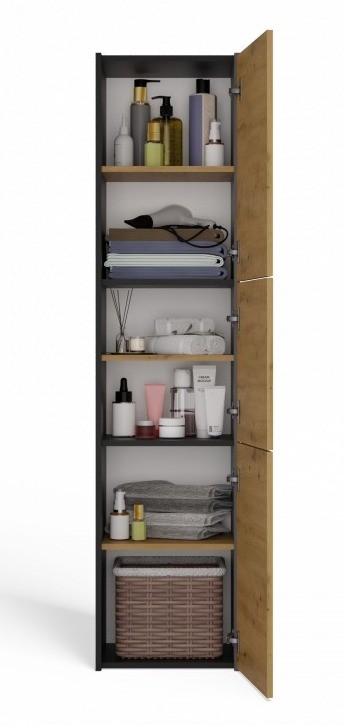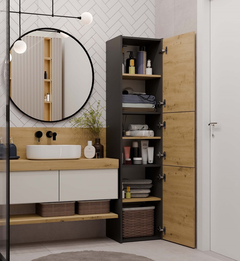 Szafka łazienkowa Sara S43 w kolorze antracyt/dąb artisan to doskonałe połączenie elegancji i funkcjonalności, które wprowadzi do Twojej łazienki nowoczesny, a zarazem przytulny charakter. Uniwersalna stylistyka oparta na kontrastowym zestawieniu ciemnego korpusu i ciepłych drewnianych frontów sprawia, że mebel pasuje zarówno do minimalistycznych, jak i bardziej klasycznych aranżacji. Dzięki sześciu praktycznym przestrzeniom do przechowywania za trzema drzwiczkami słupek pozwala na wygodne uporządkowanie wszystkich niezbędnych akcesoriów łazienkowych.