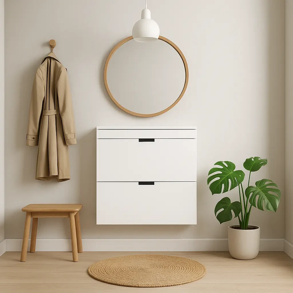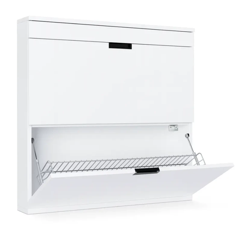 Akutan to praktyczna szafka na buty, która wyposażona została w dwa pojemne kosze na buty, zdolne pomieścić do 4 par obuwia każdy. Dzięki minimalnej głębokości (17 cm) można ustawić ją nawet w wąskim przedpokoju czy korytarzu. Otwierany do góry schowek pozwala na przechowywanie w nim kluczy lub innych podręcznych rzeczy. Mebel został stworzony głównie bo to aby zaoszczędzić miejsce i dobrze zagospodarować przestrzeń przeznaczoną do przechowywania obuwia.