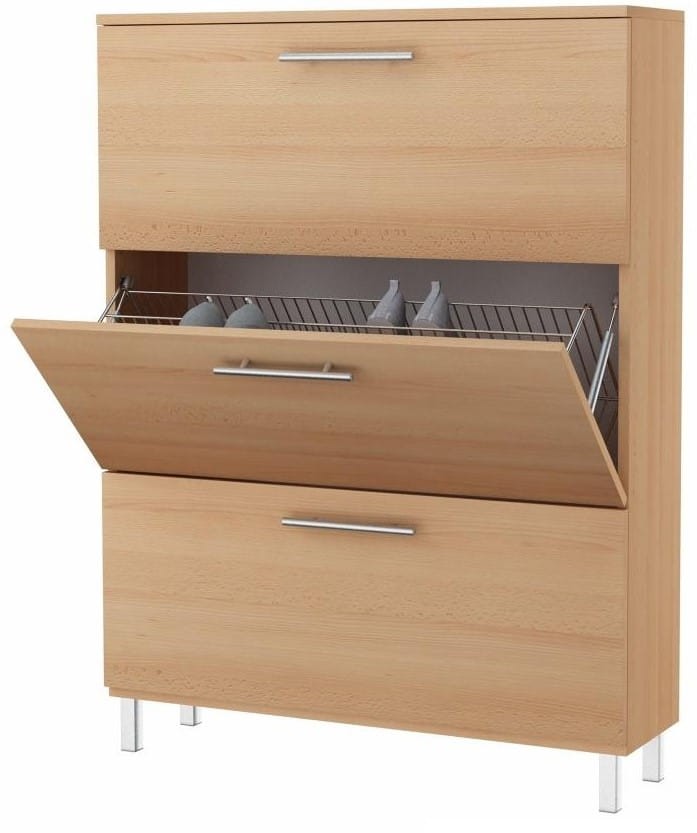 Szafka na buty Kaldas jest propozycja niewielkiej i praktycznej szafki do przedpokoju lub korytarza. Jest to mebel, który pomimo niepozornych rozmiarów dzięki sprytnemu zaprojektowaniu pomieści nawet 24 pary butów. Zaoszczędzenie miejsca w przedpokoju oraz funkcjonalne zagospodarowanie przestrzeni przeznaczonej na obuwie nie musi być wyzwaniem. Szafka wyposażona została w trzy solidne i wytrzymałe dwurzędowe kosze na obuwie. Każdy z nich jest w stanie pomieścić do 8 par butów. Mebel cechuje wysoki standard wykończenia, za który odpowiada pogrubiona płyta laminowana z obrzeżami zabezpieczonymi okleiną PCV. Dodatkowo szafka na buty wyposażona jest w podnośniki gazowe a także metalowe uchwyty typu relingi.