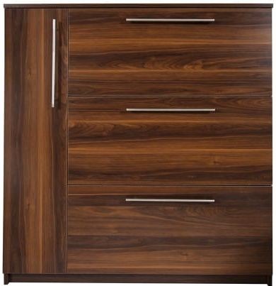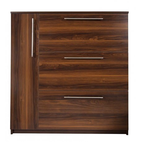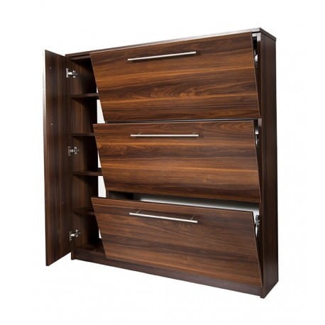 Gasper to praktyczna szafka na buty, która została stworzona specjalnie z myślą o niewielkich korytarzach i przedpokojach. To model szafki, który pozwala maksymalnie zaoszczędzić miejsce w przedpokoju oraz funkcjonalnie zagospodarować dostępną przestrzeń przeznaczoną do przechowywania obuwia. Szafka na buty Gasper wyposażona jest w aż trzy metalowe, dwurzędowe szerokie kosze na obuwie. Każdy z koszy może pomieścić nawet 8 par obuwia. W lewej części mebla, za zamykanym frontem znajdują się praktyczne półki. To dodatkowe miejsce w szafce jest idealne do przechowywania nie tylko butów, ale też akcesoriów takich jak szaliki, czapki czy torebki.
