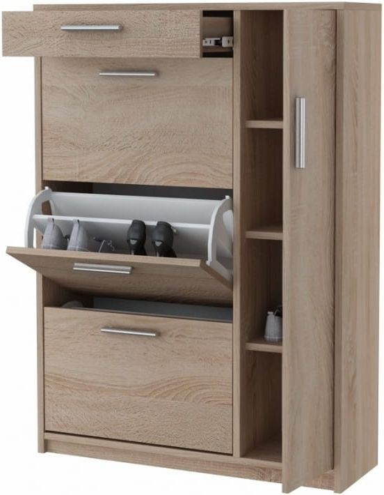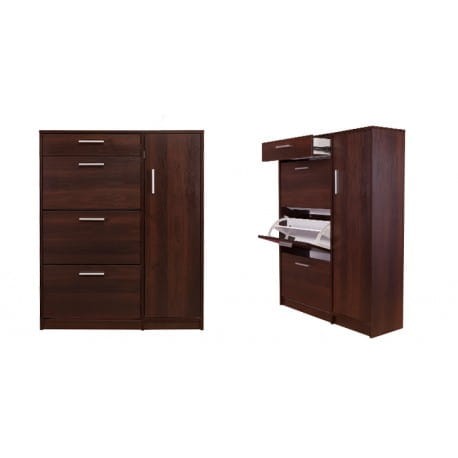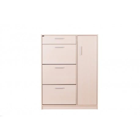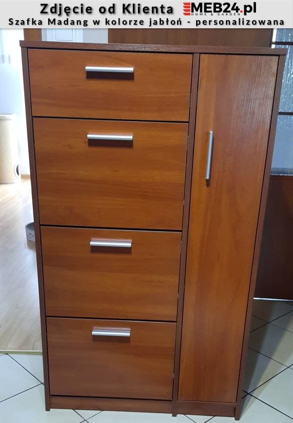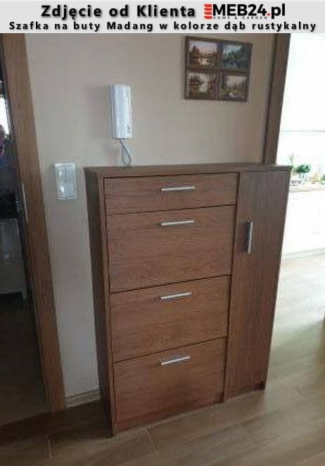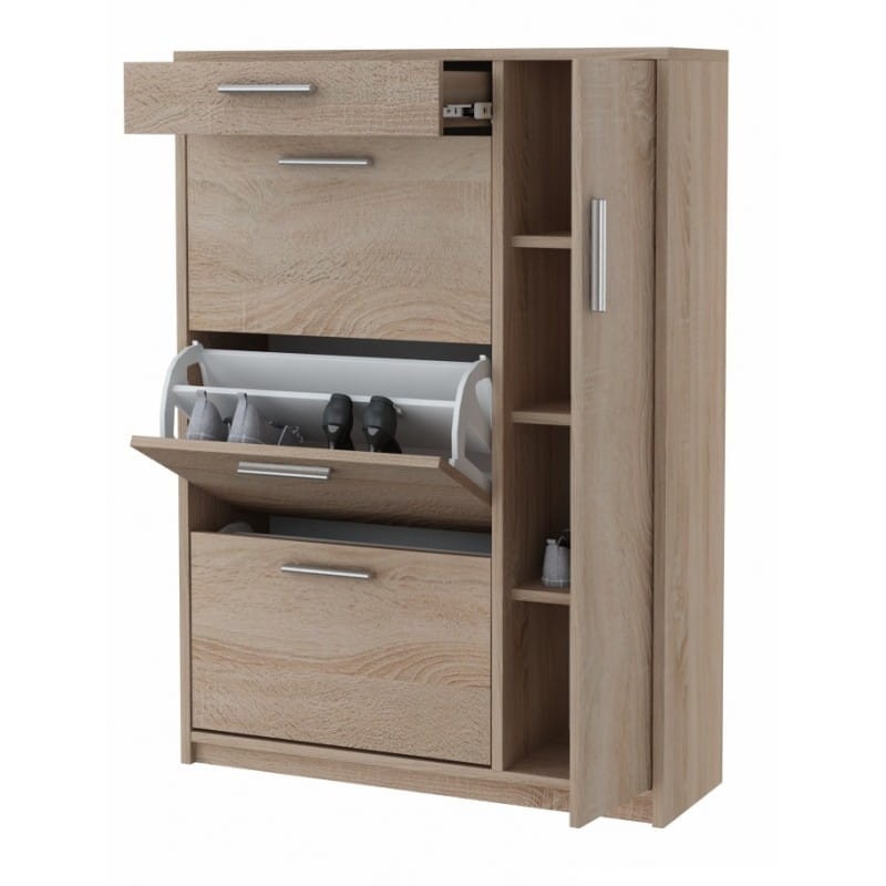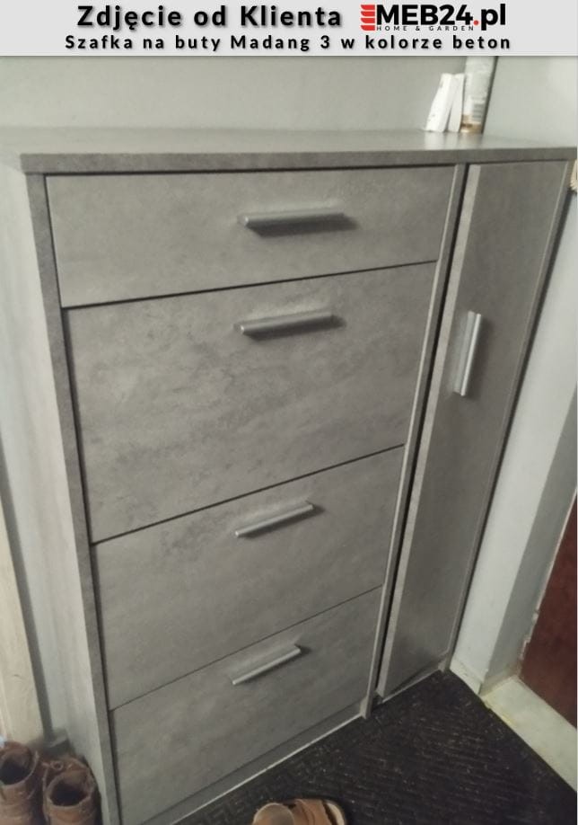 Madang to praktyczna szafka na buty zdolna pomieścić nawet 18 par butów. To model, który posiada szufladę na pełen wysuw a także trzy dwurzędowe, plastikowe schowki na obuwie, które zdolne są pomieścić do 6 par obuwia każdy. Z boku umieszczony został front otwierany klasycznie - do boku, którego wnętrze wyposażone zostało w 3 półki, które tworzą przestrzenie idealne do przechowywania akcesoriów (takich jak torebki), wysokiego obuwia czy niewielkich przedmiotów, jak czapki, szaliki lub pasty. Wygodne uchwyty ułatwiają otwieranie i zamykanie frontów. Madang to szafka na buty stworzona dla osób ceniących sobie funkcjonalność i maksymalne zagospodarowaną przestrzeń w przedpokoju.