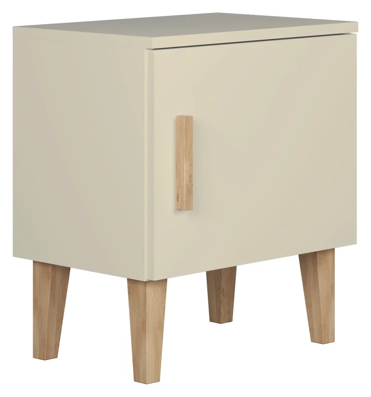 Szafka nocna Kubi to nowoczesna propozycja praktycznej szafki nocnej do sypialni z serii mebli do pokoju dziecięcego KUBI. Szafka wykonana została z wysokiej jakości matowej płyty MDF o grubości 18 mm. Nogi, tak jak i ergonomiczny uchwyt, wykonane są z lakierowanego litego drewna dębowego. Solidna budowa gwarantuje trwałość oraz bezpieczeństwo użytkowania. Montaż drzwiczek jest uniwersalny, więc można je zamontować z dowolnej strony. Szafeczka posiada cichy domyk montowany na klik. Wewnątrz posiada jedną półkę, która umożliwia przechowywanie najpotrzebniejszych rzeczy dziecka. Do szafki nocnej dołączone są kątowniki mocujące mebel do ściany, by był on bezpieczny i nie przechylił się po otwarciu drzwiczek.