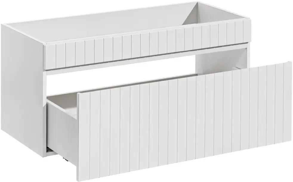 Szafka pod umywalkę Iconic White, to unikalny mebel do łazienki. Szafka pod umywalkę Iconic White została wyposażona w pojemną szufladę, która pomieści sporo kosmetyków lub innych akcesoriów łazienkowych. W kolekcji mebli z tej serii zostały wykorzystane pionowe frezowania we frontach i korpusie. Ryflowanie, to szczególnie atrakcyjny i wszechstronny efekt wzorniczy wprowadzający ruch i płynność do każdego wnętrza łazienki. Nowoczesna kolorystyka jest naszą odpowiedzią na zmieniające się trendy oraz potrzeby wizualne klientów, które stają się coraz bardziej wyszukane. Kolekcja jest modułowa, co daje możliwość tworzenia zestawów odpowiednich do łazienek w każdym rozmiarze.