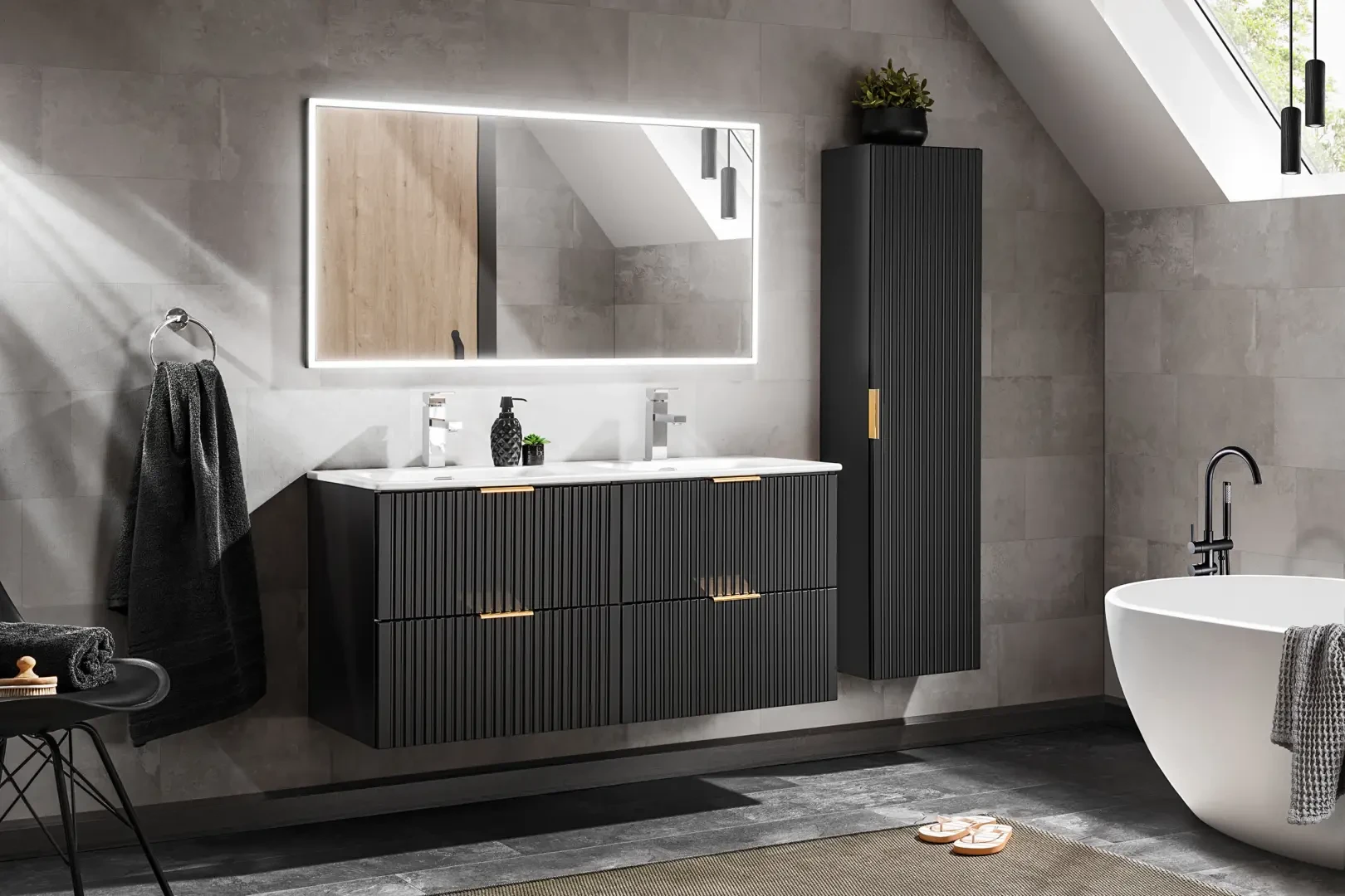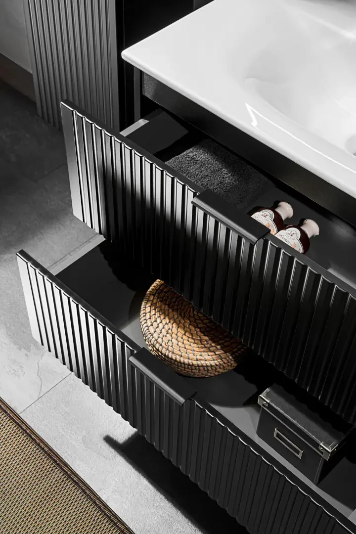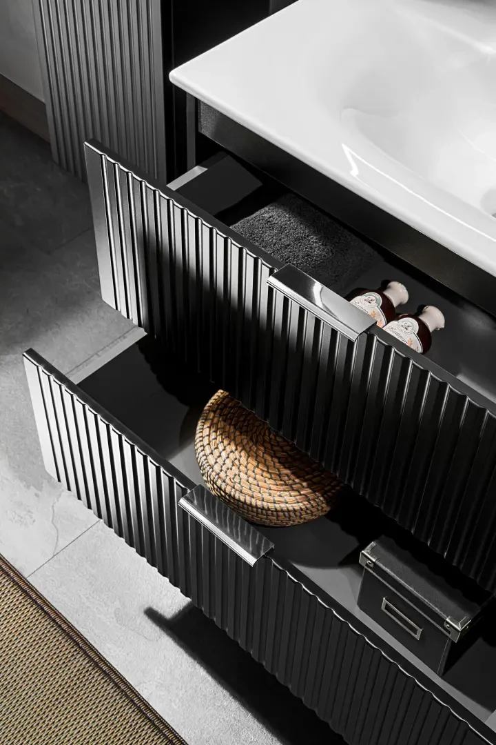 Szafka pod umywalkę Adel Black to praktyczny mebel do każdej łazienki. Szafka pod umywalkę Adel Black została wyposażona w dwie pojemne szuflady, które doskonale sprawdzą się jako miejsce do przechowywania kosmetyków i innych akcesoriów łazienkowych. Kolekcja Adel to klasyczne proporcje brył połączone z wyjątkowymi frezowanymi pionowo frontami. Dzięki takiemu zestawieniu meble z tej kolekcji są uniwersalne i idealnie sprawdzają się zarówno w nowoczesnych, jak i klasycznych aranżacjach, a ich wysoka funkcjonalność zapewni komfort nawet najbardziej wymagającym użytkownikom. Zaletą tej kolekcji jest również możliwość wyboru koloru uchwytów, ponieważ w zestawie do każdej szafki są trzy opcje kolorystyczne: złoty połysk, chrom połysk oraz czarny mat.