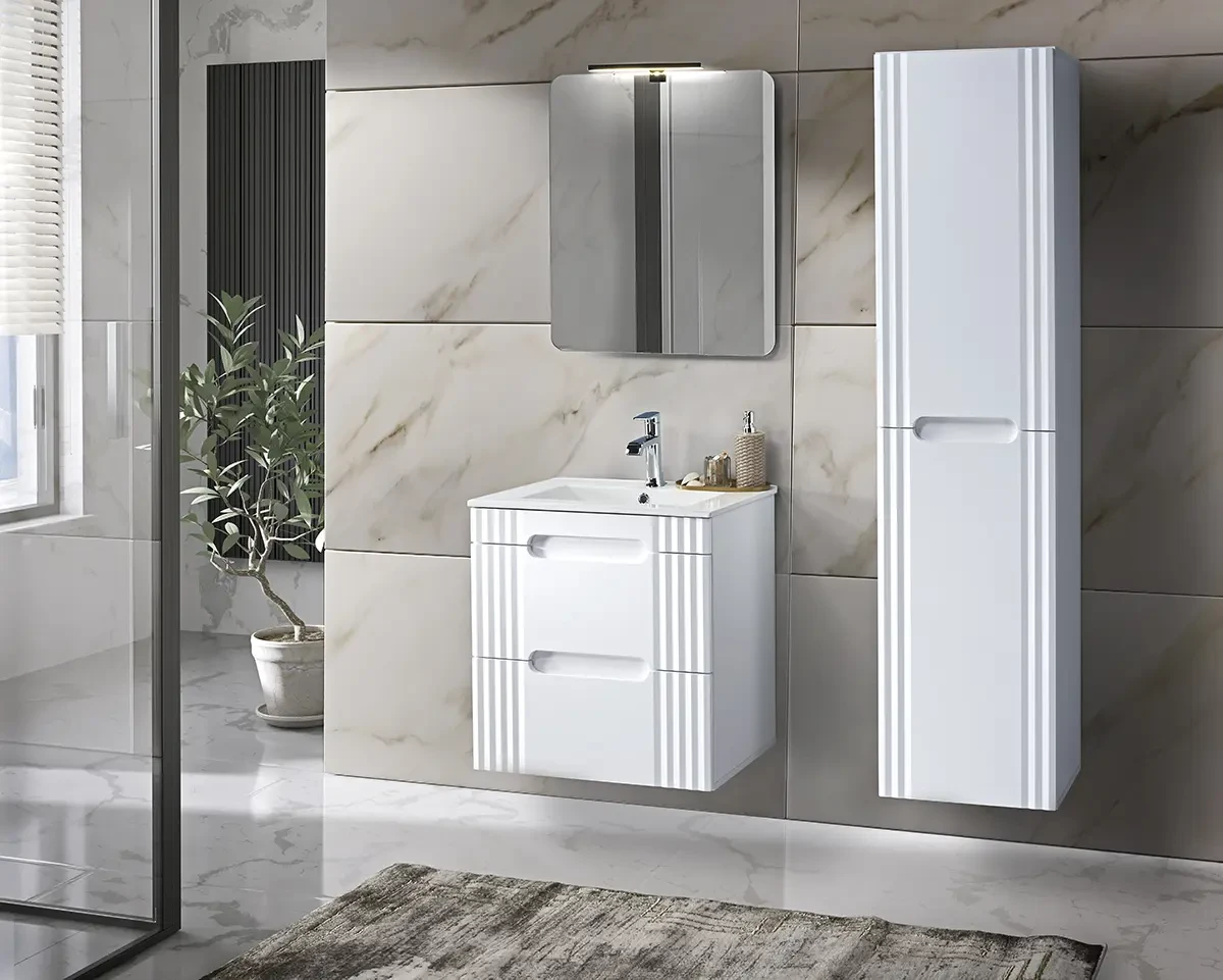 Szafka pod umywalkę Fiji White to praktyczny mebel do każdej łazienki. Szafka została wyposażona w dwie pojemne szuflady, które stanowią doskonałe miejsce do przechowywania kosmetyków i innych akcesoriów łazienkowych. Fiji White jest kolekcją, która łączy w sobie nowoczesność oraz ponadczasowy styl. Meble z tej linii mogą zostać zmontowane opcjonalnie jako wiszące lub stojące na drewnianych nogach. Uchwyty zastąpił nowoczesny frezowany podchywt, a fronty szafek wyróżniają się delikatną plisą po bokach.