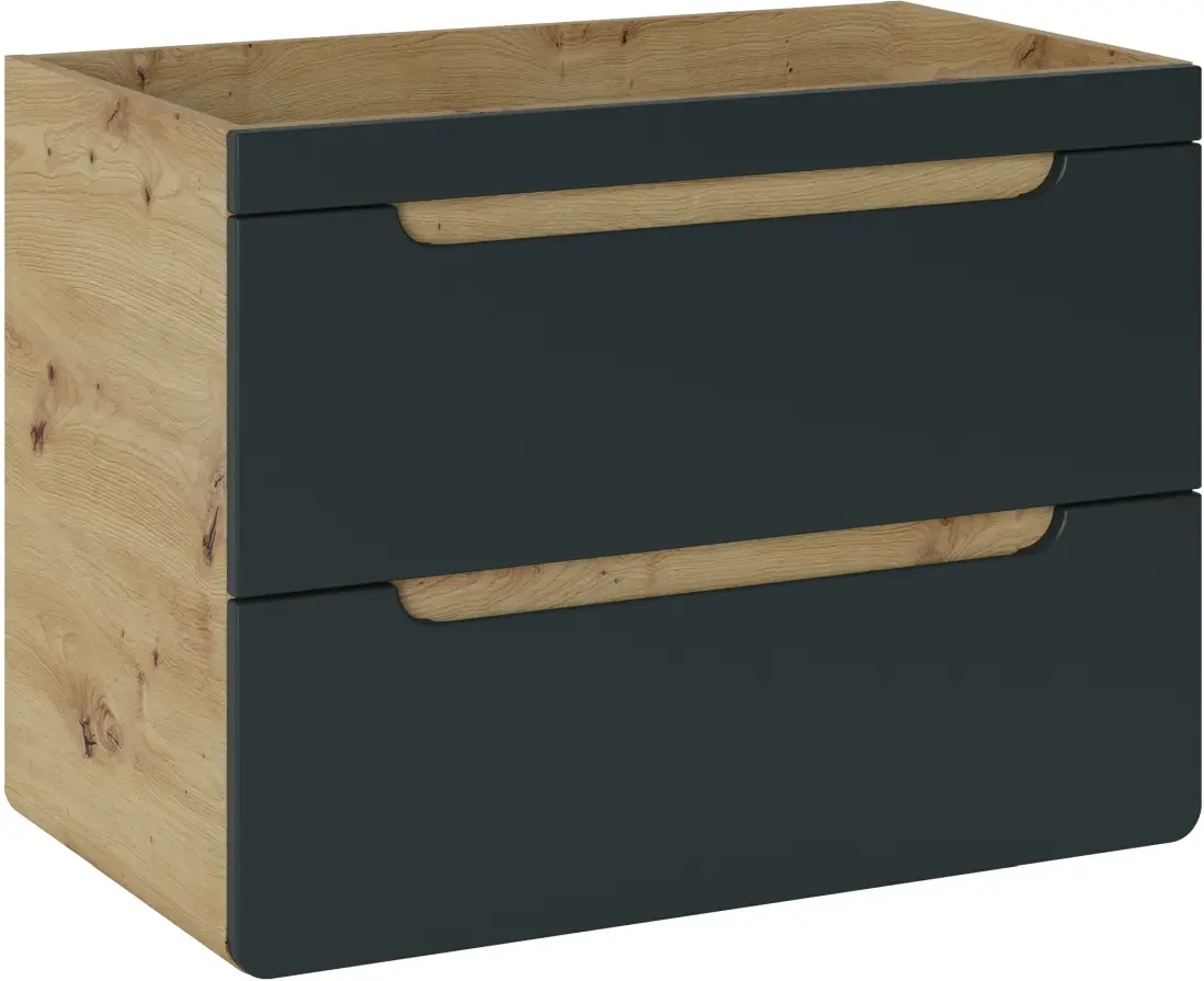 Szafka łazienkowa Aruba pod umywalkę, wykonana w nowoczesnym stylu, łączy w sobie elegancję i funkcjonalność. Szafka posiada dwie przestronne szuflady, które zapewniają wystarczającą ilość miejsca do przechowywania niezbędnych akcesoriów łazienkowych. Szuflady te zostały wyposażone w prowadnice z cichym domykiem, co zwiększa komfort użytkowania i dodaje element luksusu. Kolorystyka szafki to połączenie dębu craft złotego z szarym cosmos, co nadaje jej wyjątkowy i nowoczesny wygląd. Dodatkowym atutem jest dostępność pozostałych mebli z tej samej kolekcji, co umożliwia stworzenie spójnego i harmonijnego wnętrza łazienki.