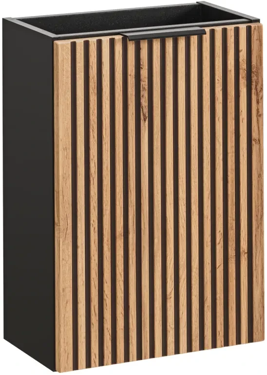 Szafka pod umywalkę Xilo, zachwyca barwą, stylem i jakością wykonania. Wyraziste słoje płyty w kolorze dąb wotan w połączeniu z czarnym ryflowaniem, to nowość na rynku meblarskim, która cieszy się coraz większym zainteresowaniem. Szafka posiada jedne drzwiczki, które można zamontować na prawą lub lewą stronę. Wewnątrz jest sporo miejsca, które można wykorzystać do przechowywania kosmetyków i innych akcesoriów łazienkowych. Kolekcja Xilo to nie tylko jakość i nowoczesny wygląd, ale również wygoda i funkcjonalność.