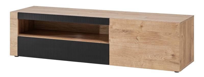 Szafka RTV Aron to połączenie elegancji i funkcjonalności w nowoczesnym wydaniu. Jej ponadczasowy dekor dębu Ribbeck z czarnymi matowymi akcentami idealnie wpisuje się w modne aranżacje salonów. Kompaktowa forma zapewnia miejsce na telewizor i niezbędny sprzęt, a jednocześnie nie przytłacza wnętrza. Solidne materiały i przemyślany układ schowków czynią ją praktycznym i estetycznym wyborem.