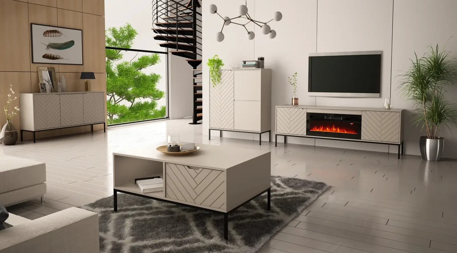 - Wbudowany kominek elektryczny: Kominek o mocy grzewczej do 1500 W z możliwością regulacji temperatury (16–28°C) i intensywności płomienia (5 poziomów) łączy funkcję estetyczną i praktyczną. Pilot zdalnego sterowania ułatwia obsługę, a dwa kolory płomieni – bursztynowy i błękitny – umożliwiają dostosowanie atmosfery do nastroju. To doskonałe rozwiązanie, które tworzy ciepłą i przytulną atmosferę w chłodne dni.