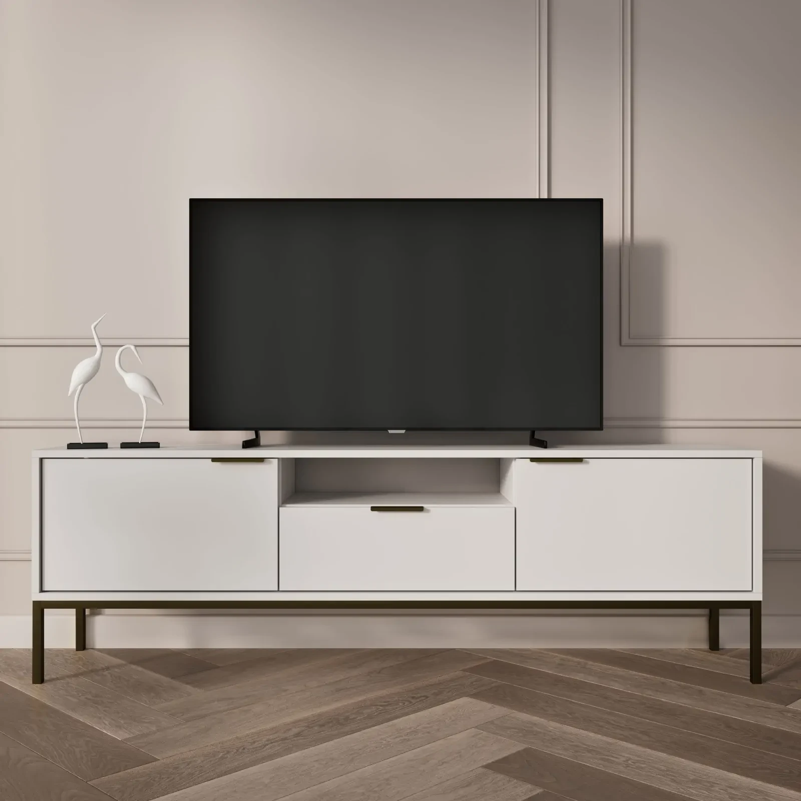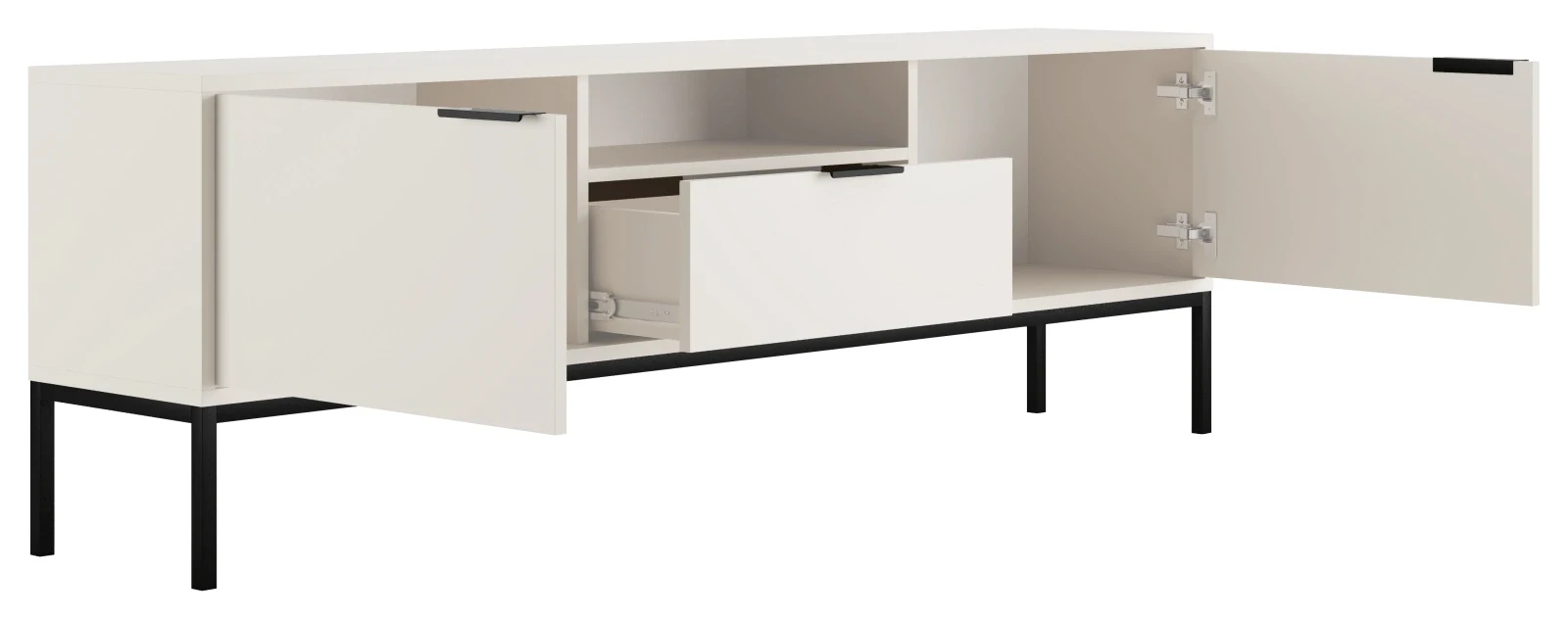 - Przestronność i organizacja: Szafka wyposażona jest w dwie zamykane szafki, jedną pojemną szufladę z pełnym wysuwem oraz otwartą półkę w centralnej części, co umożliwia łatwe przechowywanie różnorodnych przedmiotów, od sprzętu RTV po dekoracje. Dzięki systemowi cichego domyku w drzwiach, użytkowanie szafki jest niezwykle komfortowe, eliminując hałas i zapewniając płynne działanie.