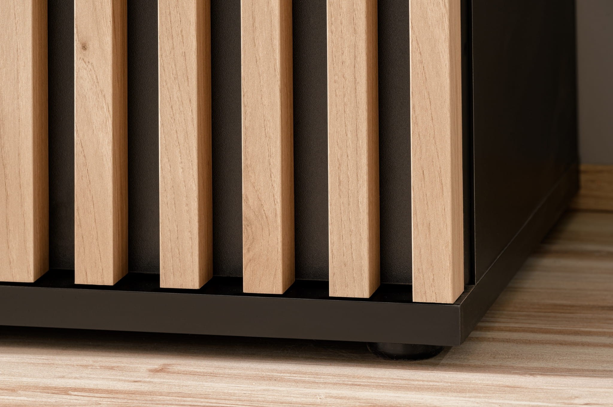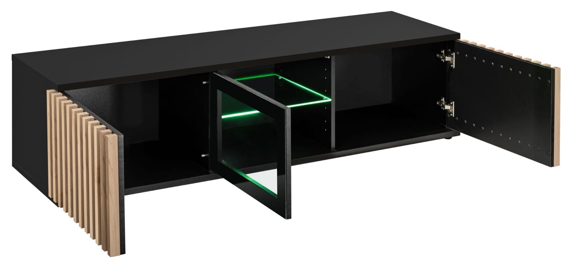 - Elegancja i nowoczesny design: połączenie matowego czarnego wykończenia z naturalnymi lamelami w kolorze Hickory Jackson oraz czarnym szkłem nadaje meblowi wyjątkowy, elegancki charakter. Lamele dodają wnętrzu ciepła i podkreślają nowoczesny styl.