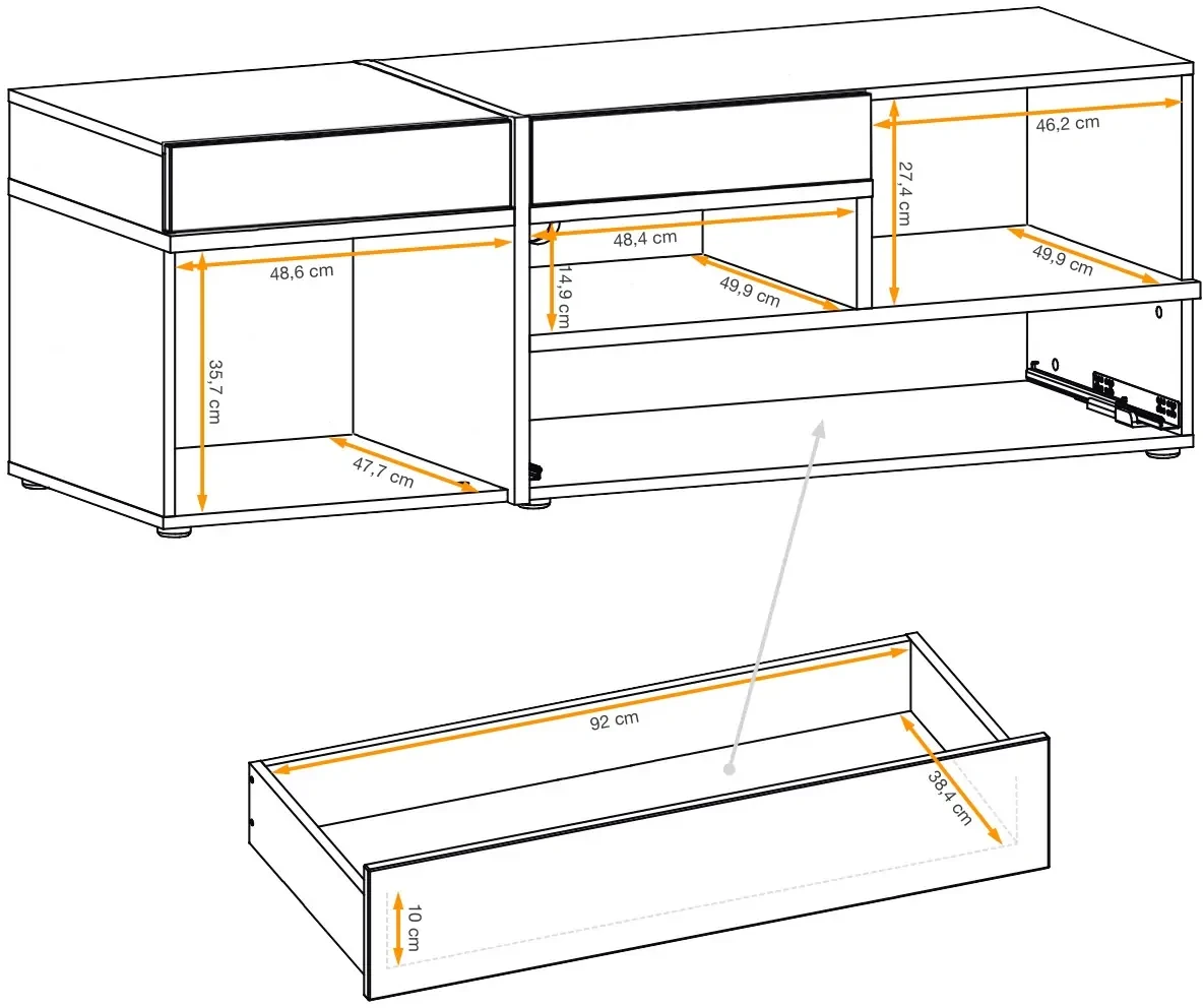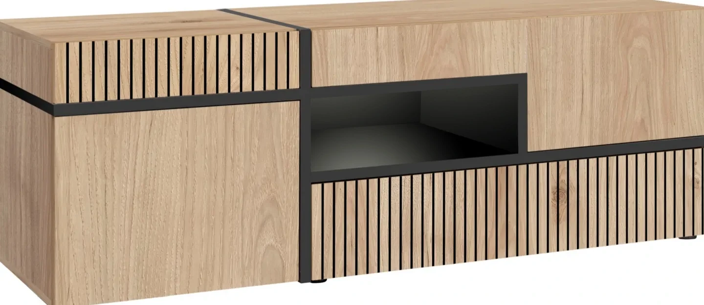 - Praktyczna organizacja - Szafka wyposażona jest w otwartą komorę z oświetleniem LED, jedną przestronną szufladę oraz dwoje drzwi, za którymi znajdują się dodatkowe komory, co umożliwia przechowywanie różnorodnych przedmiotów, takich jak sprzęt audio-wideo, książki, dekoracje, czy kolekcje DVD.