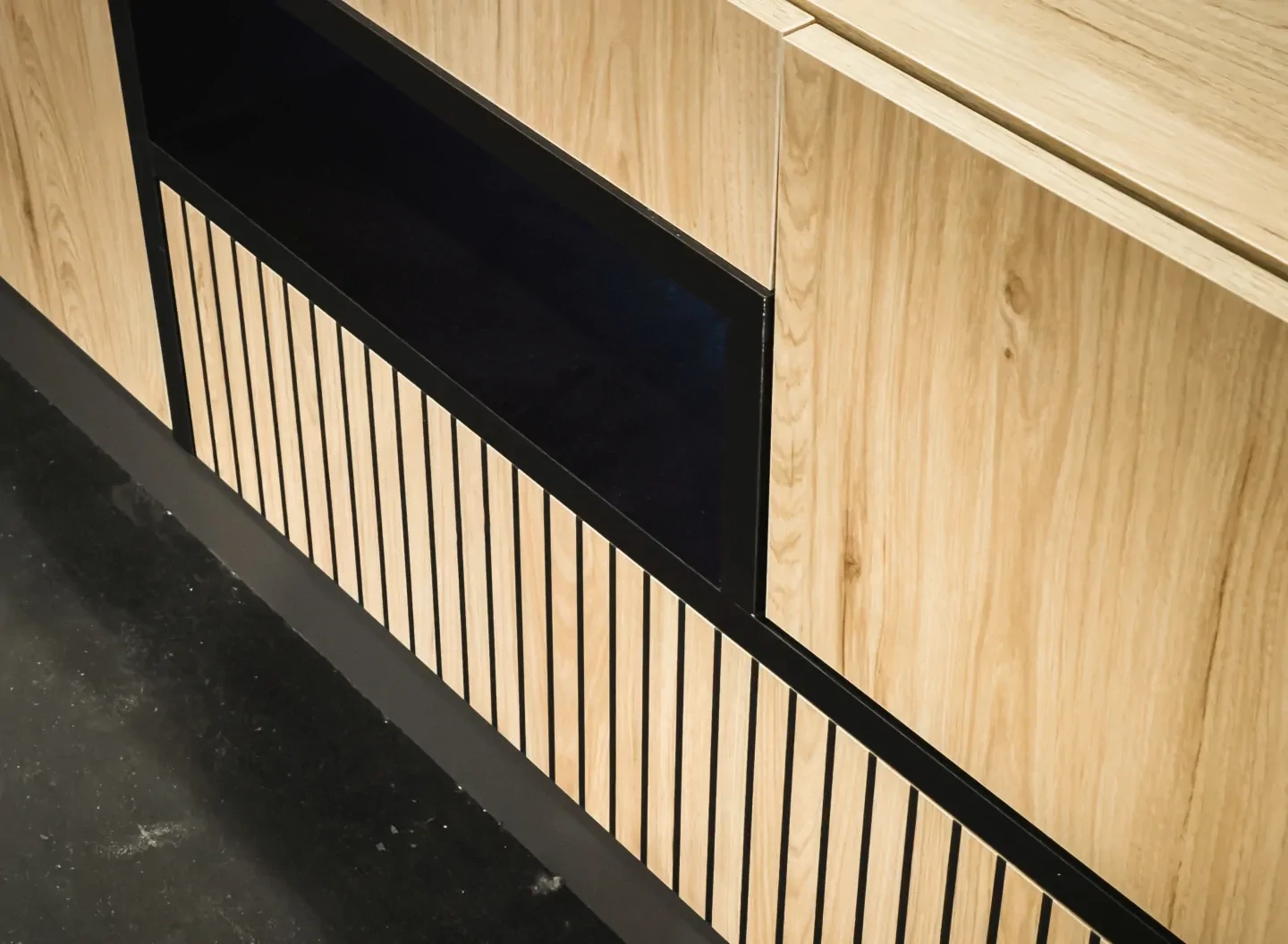 - Nowoczesny design - Połączenie laminowanego korpusu w kolorze Hickory Jackson z czarnymi paskami na froncie, w technologii nadruku, podkreśla nowoczesny styl mebla, idealnie komponując się z różnymi aranżacjami wnętrz.