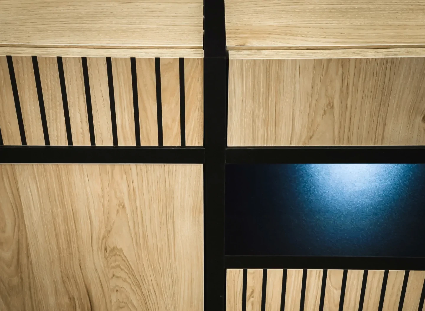 - Oświetlenie: Quad LED, białe, zainstalowane w otwartej komorze, podkreślające eksponowane przedmioty i tworzące przytulną atmosferę.