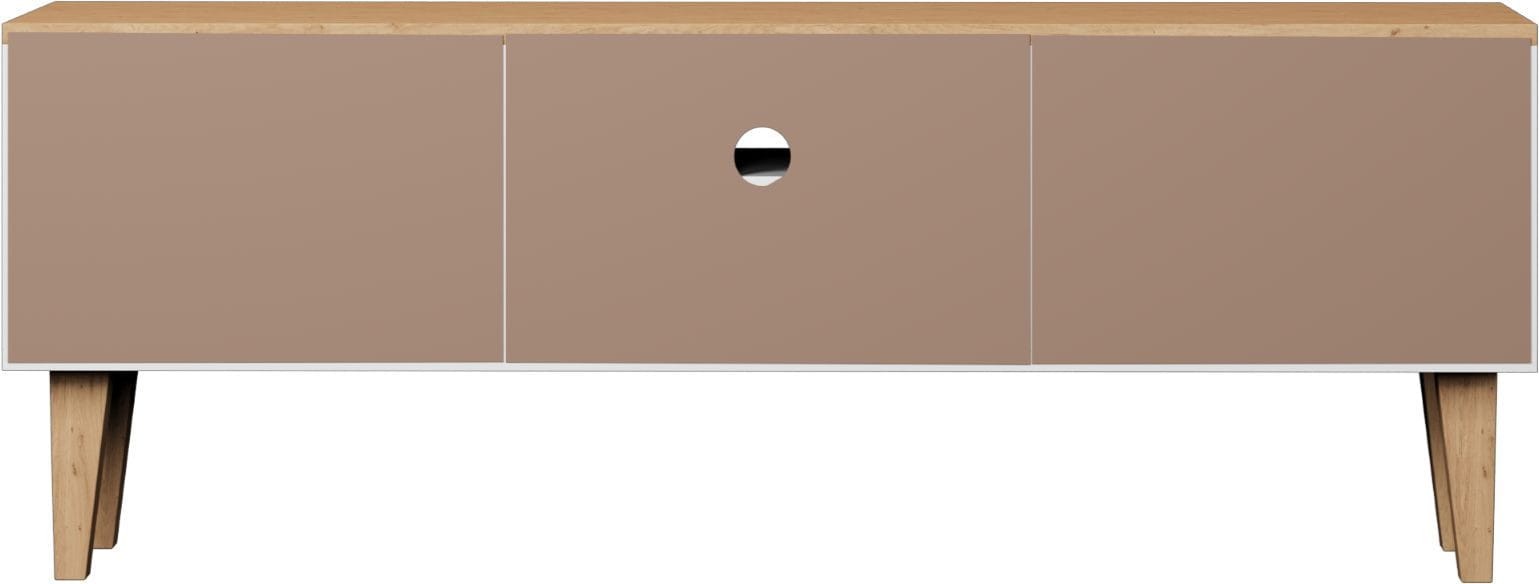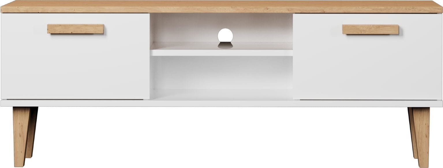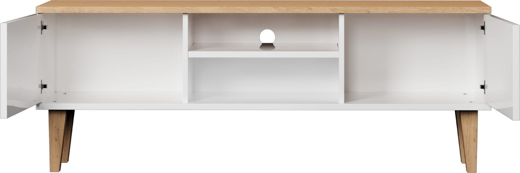 Szafka RTV Denver do salonu to praktyczny mebel pod telewizor, utrzymany w nowoczesnym skandynawskim designie. Szafka idealnie sprawdzi się w mniejszych lub średnich salonach i pokojach wypoczynkowych. Wyposażona została w dwoje drzwi oraz otwartą przestrzeń z półką, dzięki czemu znajdzie się na niej miejsce na dekoder, konsole czy inne sprzęty. Mebel posiada otwór w tylnej części, przez który z łatwością można poprowadzić kable sprzętu RTV. Szafka stoi na nóżkach o wysokości 17 cm, co ułatwia dbanie o czystość pod meblem.