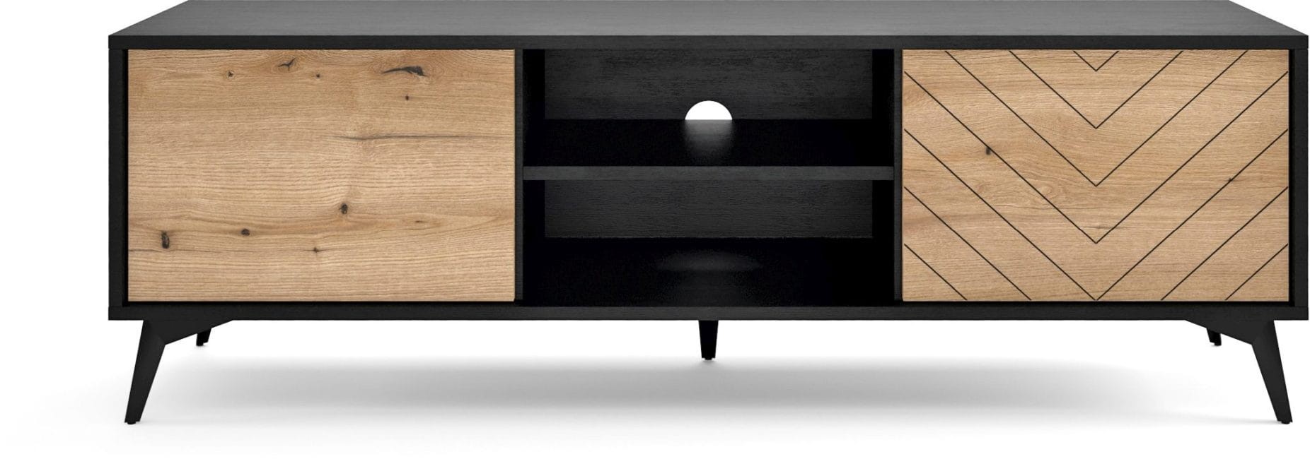 Szafka RTV Diamond to nowoczesny mebel charakteryzujący się kontrastowym połączeniem czarnego korpusu z dekorem dąb evoke na frontach. Szafka RTV jest jednym z elementów całej serii mebli Diamond, która dostępna jest w naszym sklepie. Niewątpliwym atutem szafki RTV są duże przestrzenie do przechowywania oraz miejsce na dekoder, które pomogą w dobrej organizacji miejsca w salonie i pozwolą zaoszczędzić miejsce. Nowoczesny, minimalistyczny design połączony z delikatnym kolorem drewna i czerni sprawia, że szafka RTV Diamond prezentuje się niezwykle stylowo i nowocześnie. Mebel został zaprojektowany i wykonany w Polsce co jest gwarancją jakości - Wspieraj