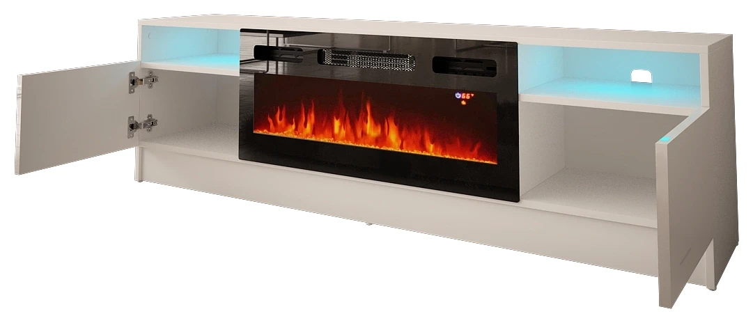 Szafka RTV Duke 160 cm z kominkiem elektrycznym i LED do salonu biały mat/połysk