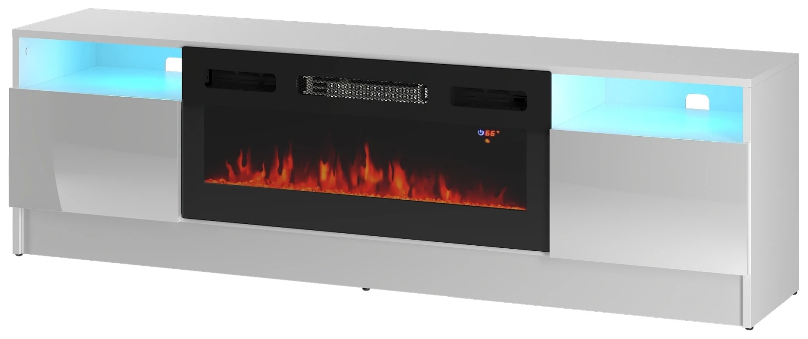 Szafka RTV Duke 160 cm to wyjątkowy mebel, który łączy nowoczesny design z praktycznymi rozwiązaniami, tworząc idealne centrum salonu. Wyposażona w wbudowany kominek elektryczny z efektem realistycznych płomieni i funkcją grzewczą, wprowadza do wnętrza ciepło i przytulność. Dodatkowe oświetlenie LED RGB pozwala na stworzenie unikalnej atmosfery, podkreślając estetykę mebla. Prosta forma, wysokiej jakości materiały oraz przemyślane rozwiązania, takie jak system otwierania „push-to-open”, sprawiają, że Duke łączy elegancję z wygodą użytkowania, stając się idealnym wyborem do nowoczesnych wnętrz.