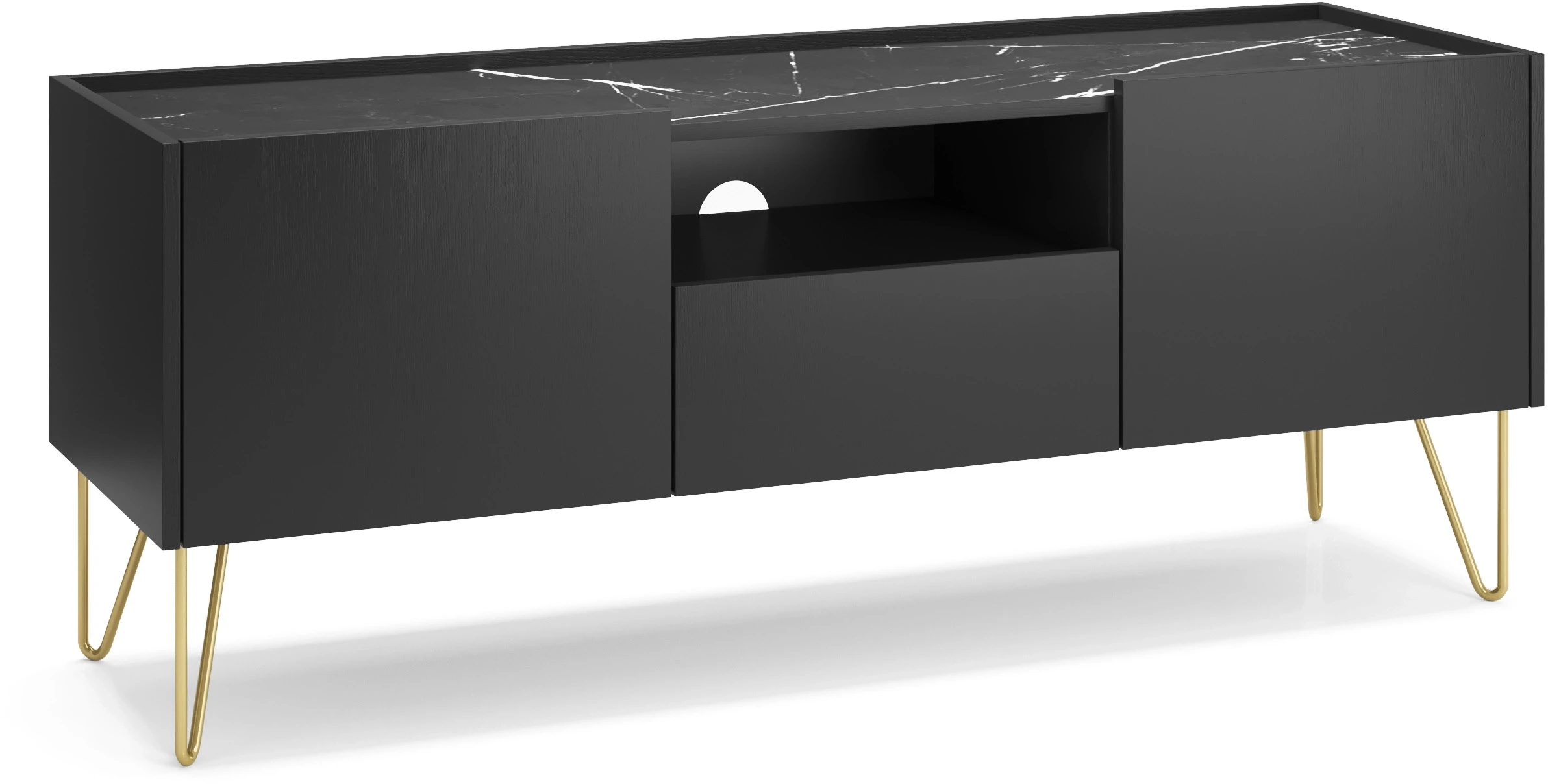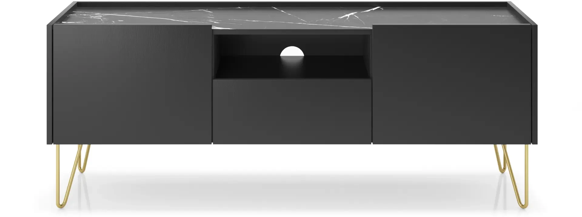 Harmony to bardzo pojemna i nowoczesna szafka RTV. Szafka RTV Harmony została wyposażona w szufladę i pojemne półki, dzięki czemu stanowi idealne miejsce do przechowywania podręcznych rzeczy, i sprzętu RTV. Szafka Harmony sprawdzi się zarówno w nowoczesnym salonie, jak też w bardziej klasycznym wnętrzu. Nowoczesny, minimalistyczny design połączony kolorystyką czerni i złotymi nogami sprawia, że szafka RTV Harmony prezentuje się niezwykle stylowo. Mebel został zaprojektowany i wykonany w Polsce co jest gwarancją jakości - Wspieraj