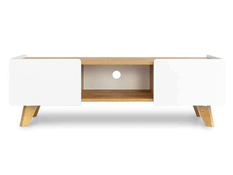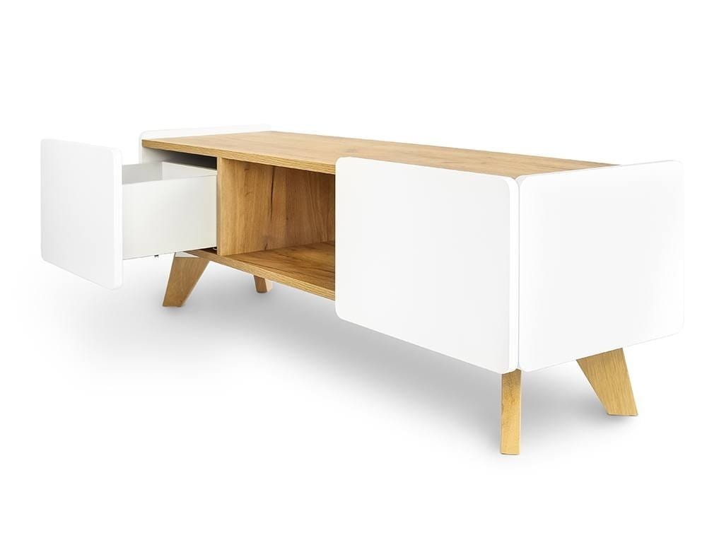 Niezwykła trwałość. Szafka RTV Skandica LETT wykonana jest z wysokiej jakości płyty w dekorze pięknego, złotego dębu. Boki i front wykonano z solidnej płyty w białym kolorze. Wytrzymałe nogi, na których wspiera się mebel, wykonane są z litego drewna dębowego i gwarantują meblu wieloletnią stabilność. Systemy w szufladach, spojenia i łączenia to najnowocześniejsze technologie (cichy domyk), skoncentrowane na wygodzie użytkowej.