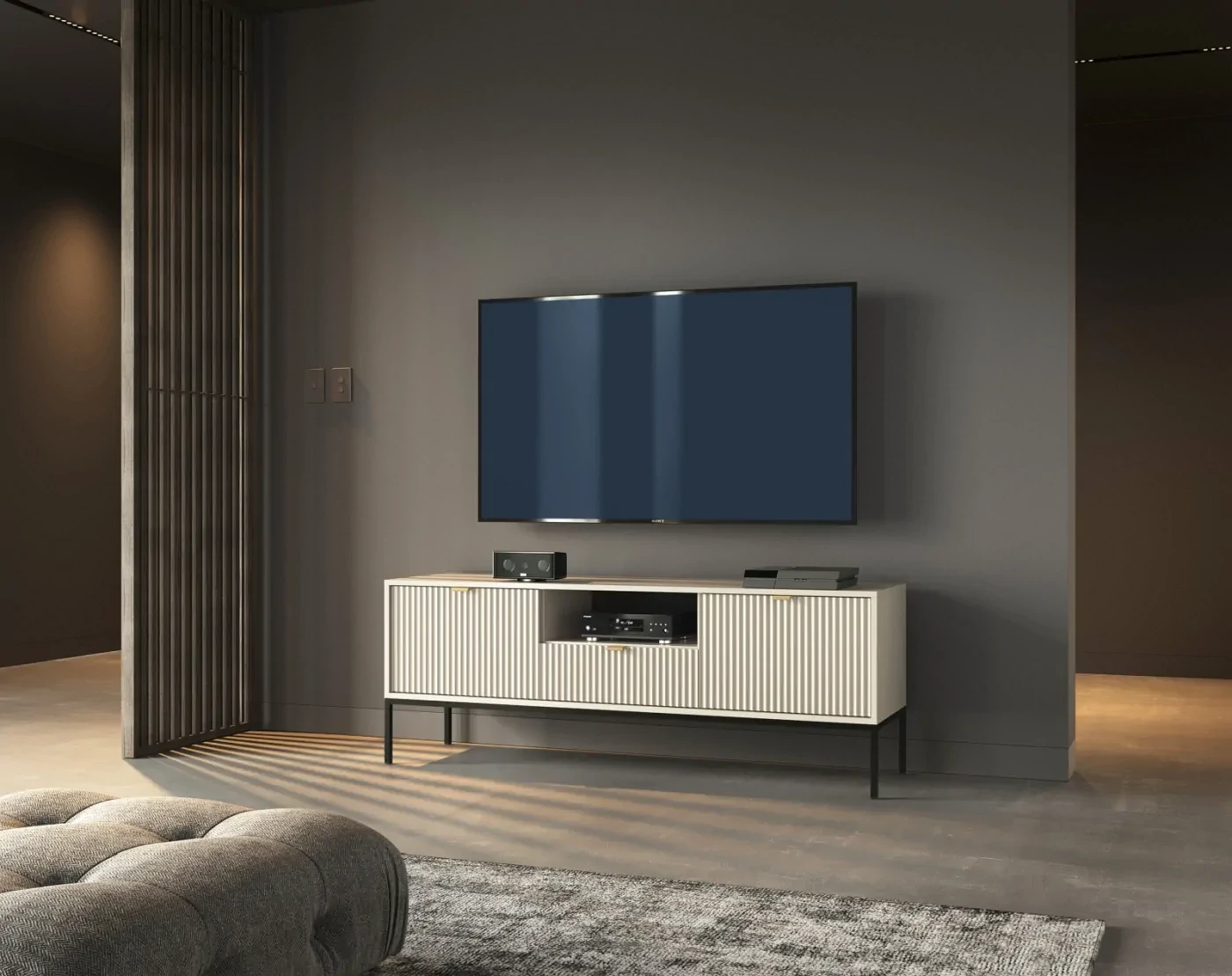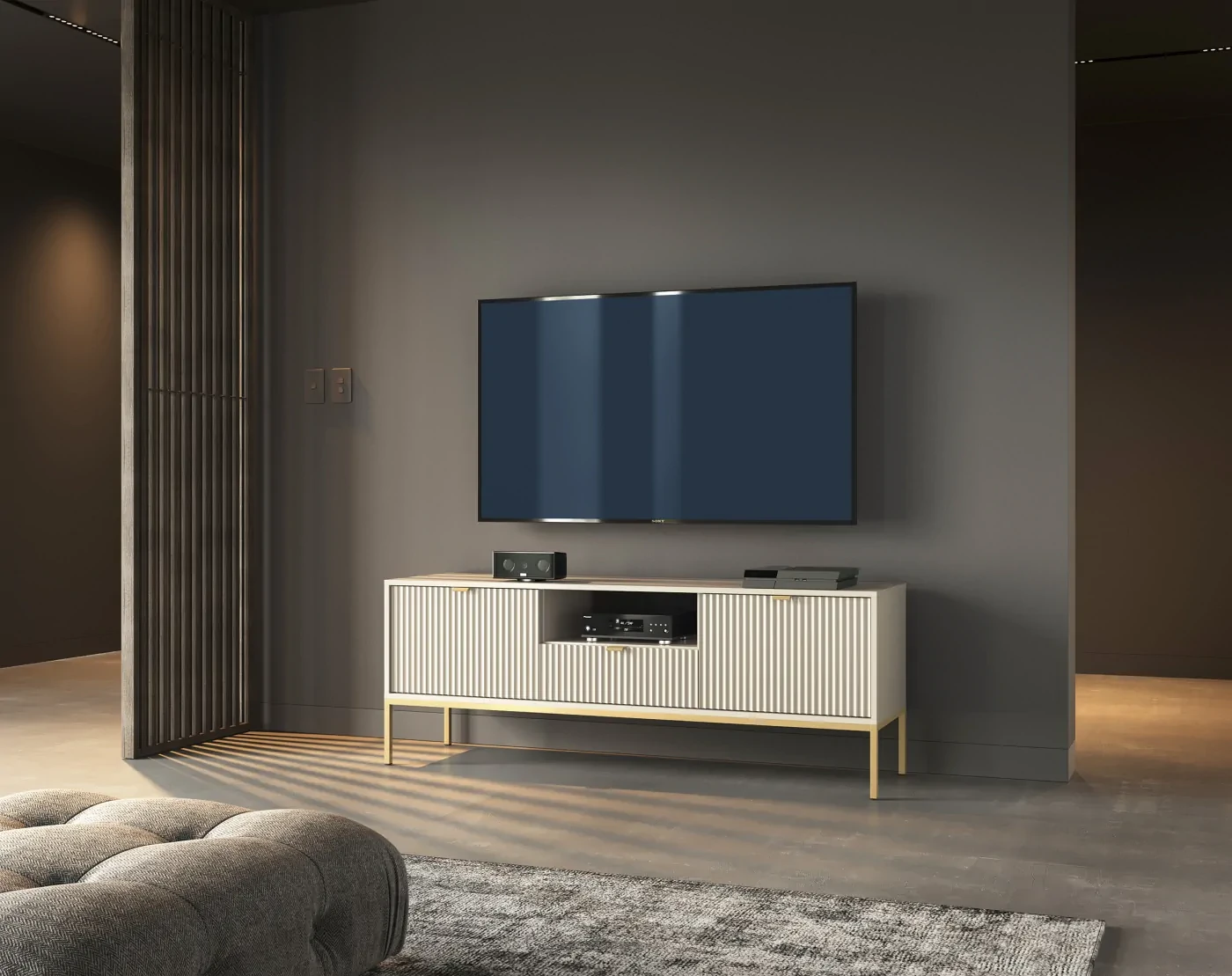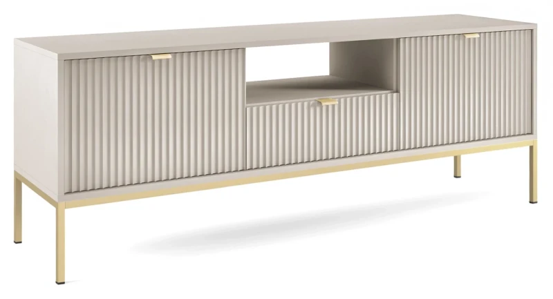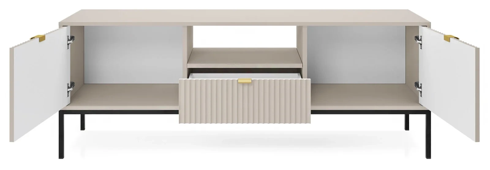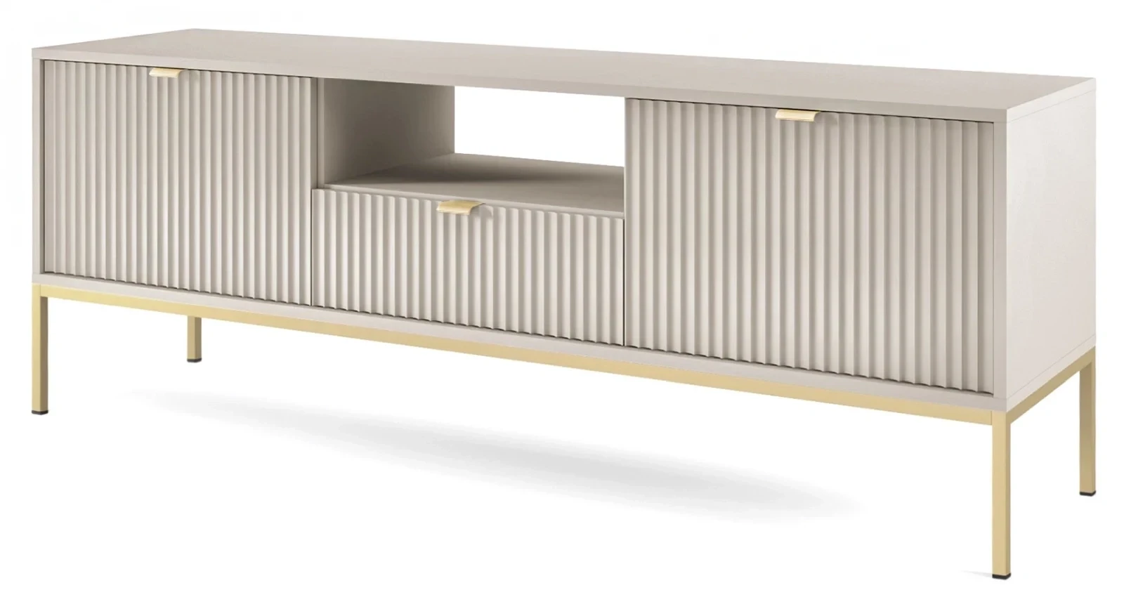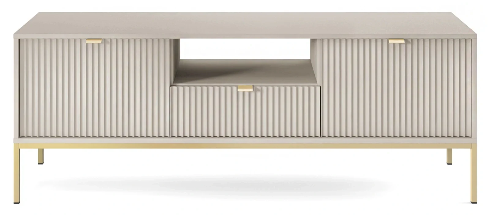 Szafka RTV Nova to funkcjonalny mebel utrzymany w nowoczesnym stylu. Szafka RTV jest jednym z elementów całej serii mebli Nova, która dostępna jest w naszej ofercie. Niewątpliwym atutem szafki są dwie duże pojemne szafki oraz szuflada, które stanowią doskonałe miejsce do przechowywania i pomogą w dobrej organizacji miejsca w salonie. Nowoczesny, minimalistyczny design połączony z kaszmirowym kolorem sprawia, że szafka RTV Nova prezentuje się niezwykle stylowo i nowocześnie. Prosta, ale elegancka forma z dekoracyjnym ryflowaniem na frontach to must have dla miłośników nowoczesnego designu. Metalowa podstawa nadaje lekkości konstrukcji a całości dopełniają ozdobne uchwyty w kolorze złotym. Mebel został zaprojektowany i wykonany w Polsce co jest gwarancją jakości - Wspieraj