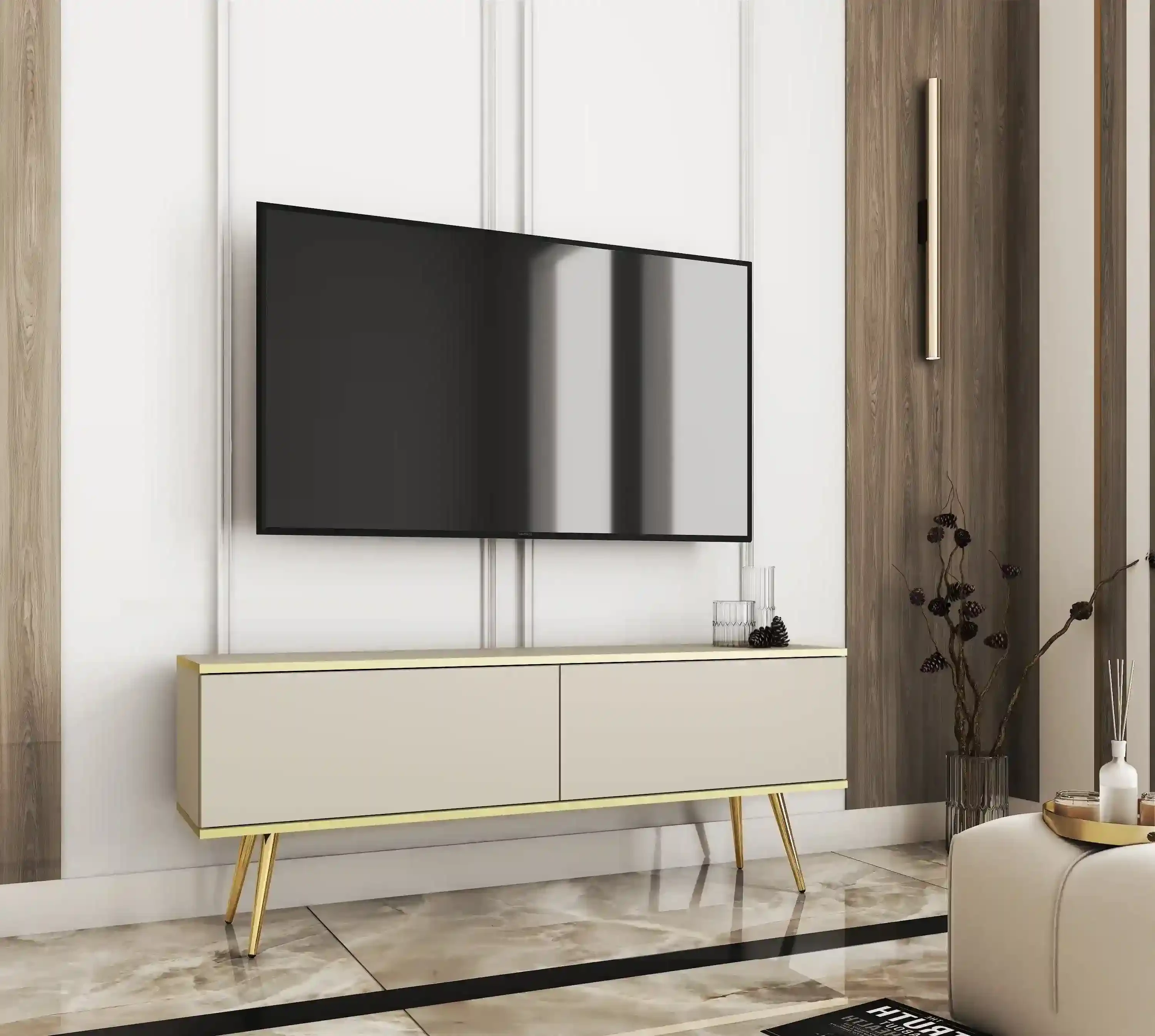 Szafka RTV Oro wisząca 135 cm beż piaskowy ze złotymi wstawkami