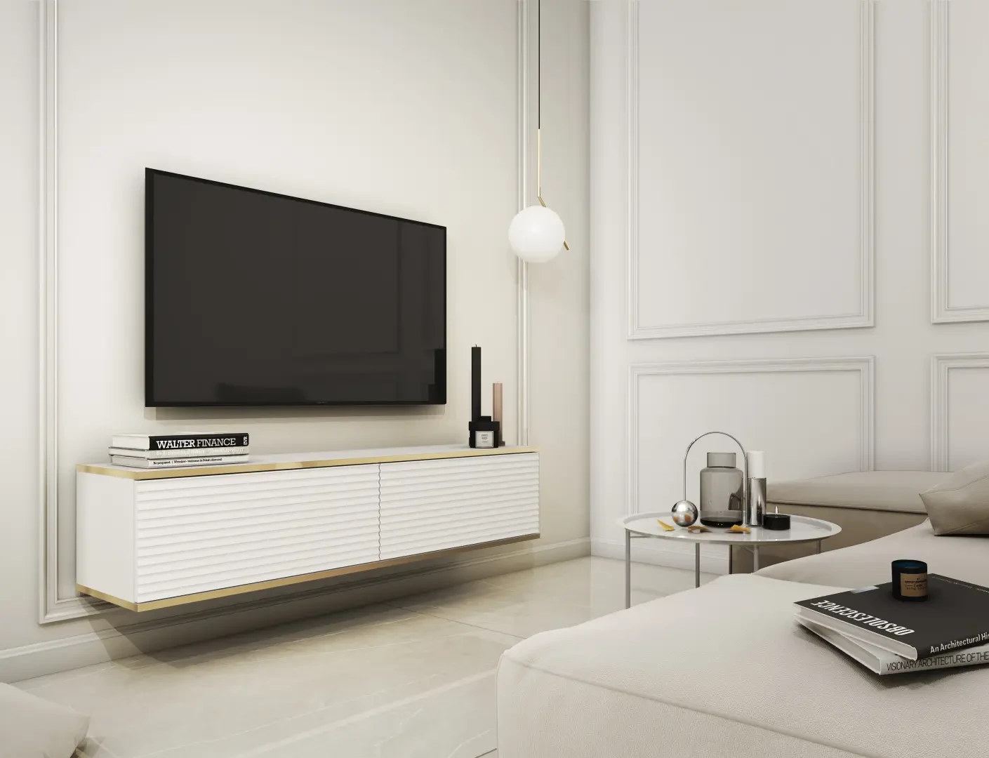 Oro to bardzo nowoczesna, wisząca szafka RTV. Szafka RTV Oro została wyposażona w dwie zamykane szafki, dzięki czemu stanowi idealne miejsce do przechowywania podręcznych rzeczy, i sprzętu RTV. Szafka Oro sprawdzi się zarówno w nowoczesnym salonie, jak też w bardziej klasycznym wnętrzu. Nowoczesny, minimalistyczny design połączony ze złotym wykończeniem oraz lamelami na froncie, sprawiają, że szafka Oro prezentuje się niezwykle stylowo. Istnieje również możliwość dokupienia dodatkowych metalowych 23 cm nóżek, w kolorze czarnym lub złotym, dzięki czemu stworzymy wersję stojącą (opcjonalnie za dopłatą). Mebel został zaprojektowany i wykonany w Polsce co jest gwarancją jakości - Wspieraj