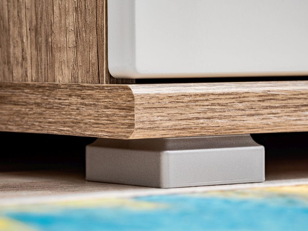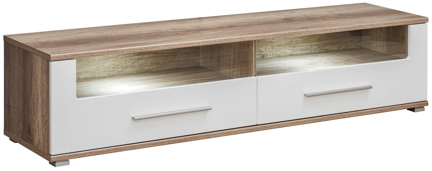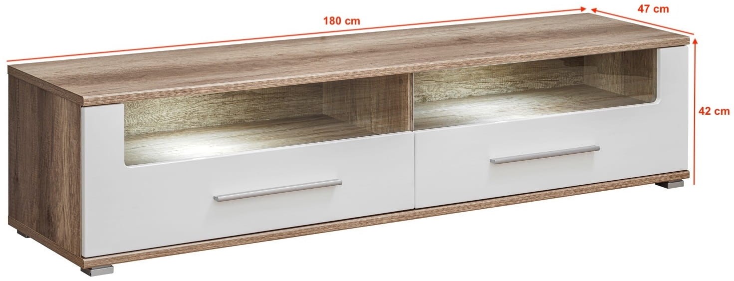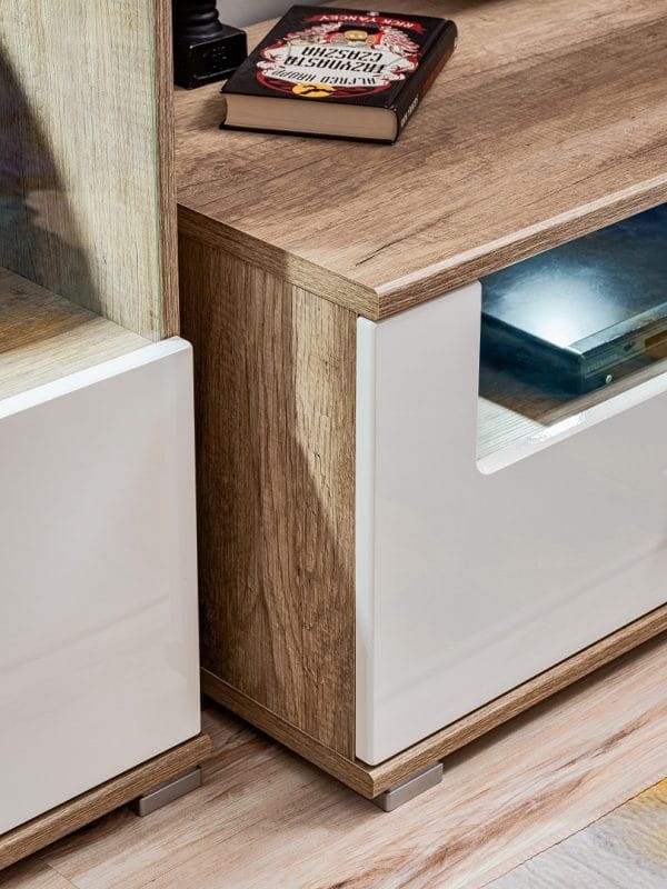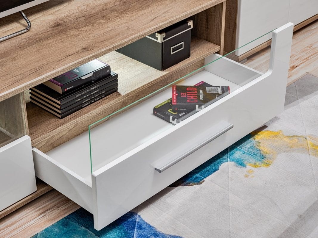 Szafka RTV SANDER dzięki zastosowaniu nowoczesnego dekoru imitującego drewno dębowe, a uzupełnia je lśniąca biel, spełnia oczekiwania dla wszystkich, którzy preferują nowoczesny design. Szafka została wykonana z płyty laminowanej (korpus) oraz płyty HDF (fronty), które zapewniają wysoką odporność na zarysowania oraz promienie słoneczne, dzięki temu zachowa swój atrakcyjny wygląd przez długi czas. Szafka RTV SANDER doskonale wpasuje się do nowoczesnego salonu, podkreślając niepowtarzalny i unikatowy styl pomieszczenia.