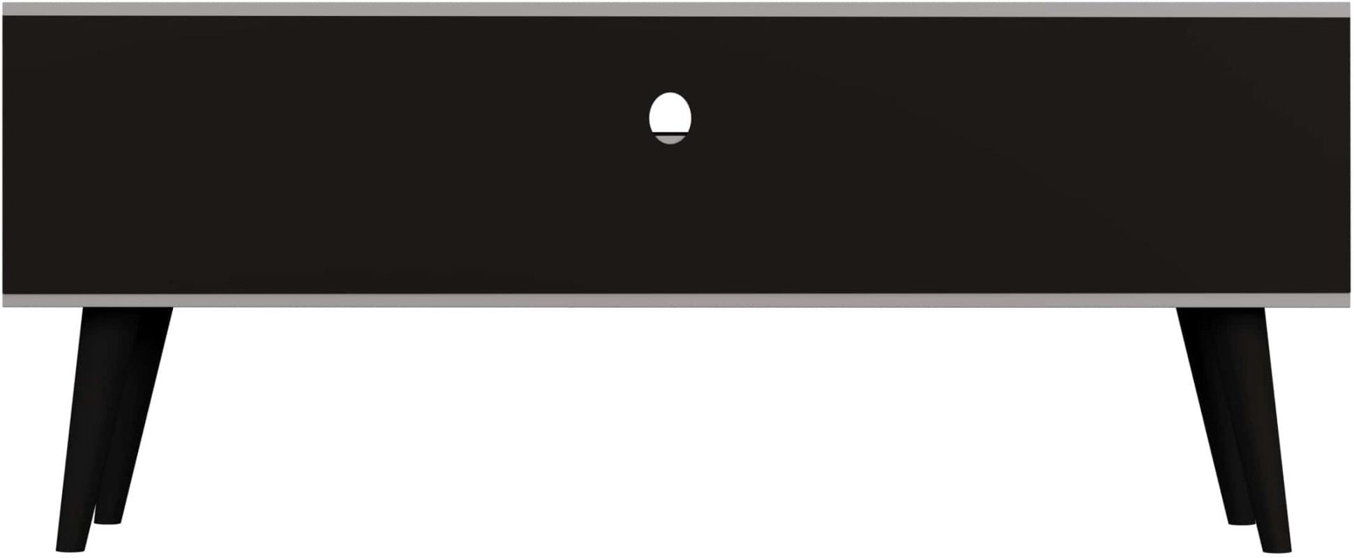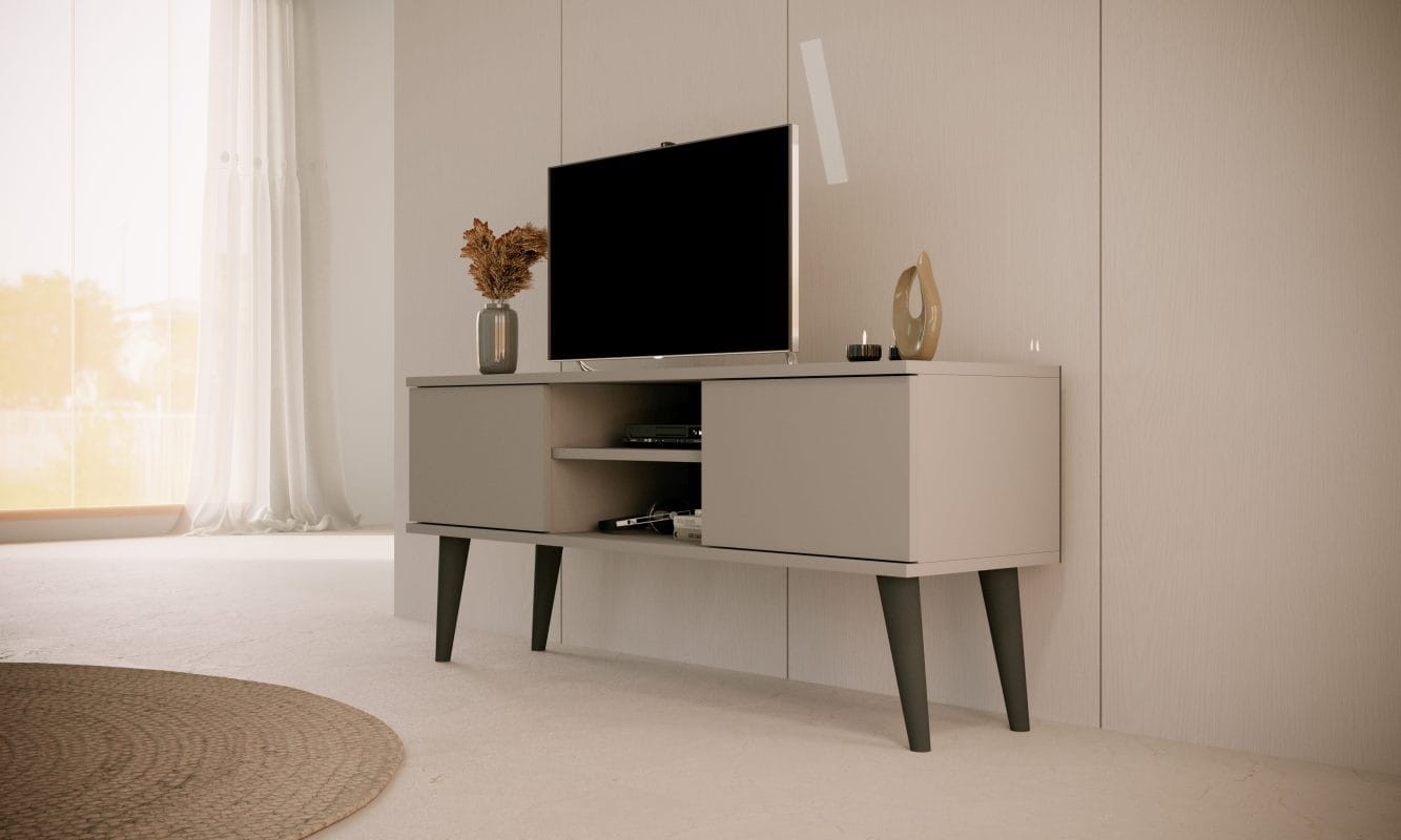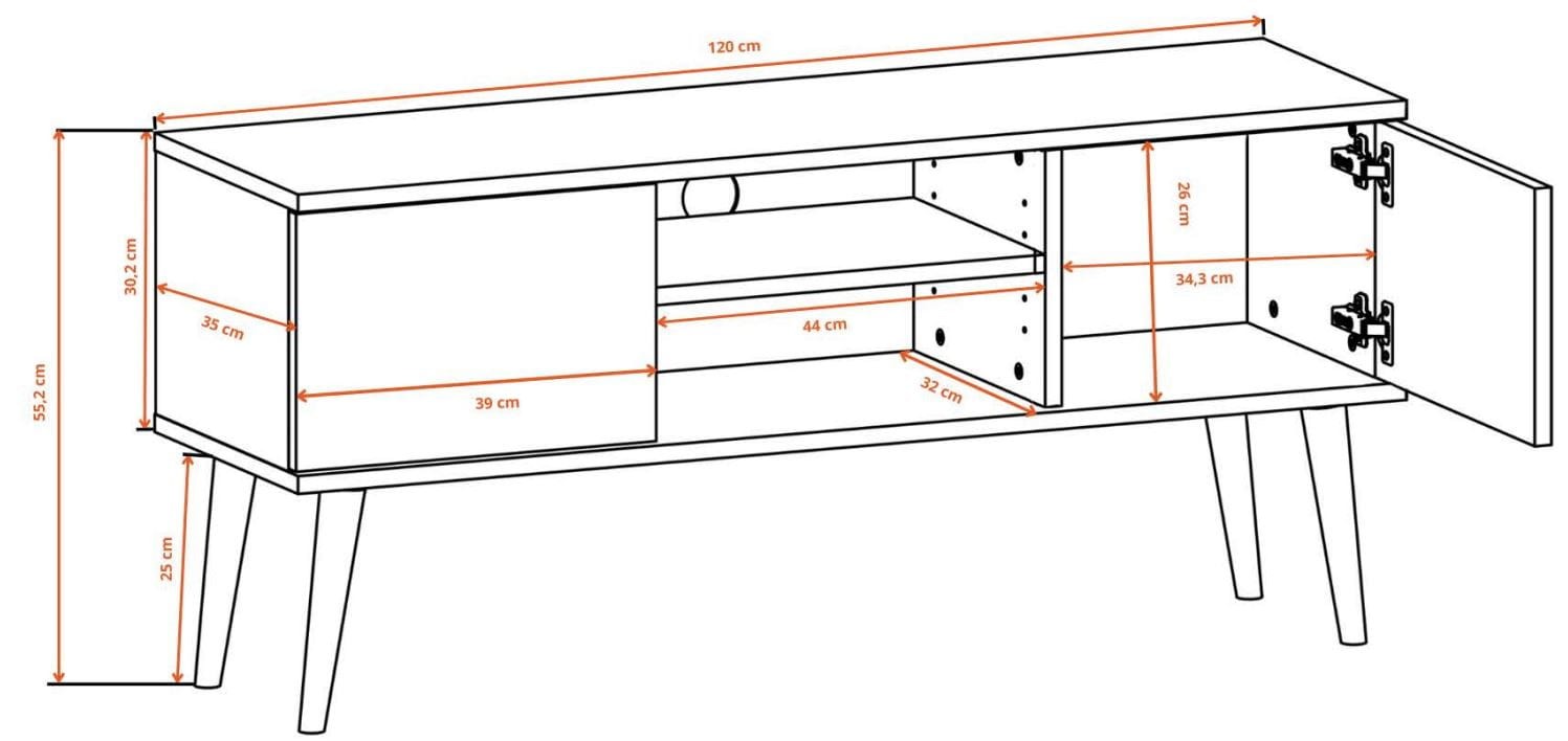 Szafka RTV Toronto do salonu to praktyczny mebel pod telewizor, utrzymany w nowoczesnym skandynawskim designie. Szafka idealnie sprawdzi się w mniejszych lub średnich salonach i pokojach wypoczynkowych. Wyposażona została w dwoje drzwi oraz otwartą przestrzeń z półką, dzięki czemu znajdzie się na niej miejsce na dekoder, konsole czy inne sprzęty. Mebel posiada otwór w tylnej części, przez który z łatwością można poprowadzić kable sprzętu RTV. Szafka stoi na nóżkach o wysokości 25 cm, co ułatwia dbanie o czystość pod meblem.