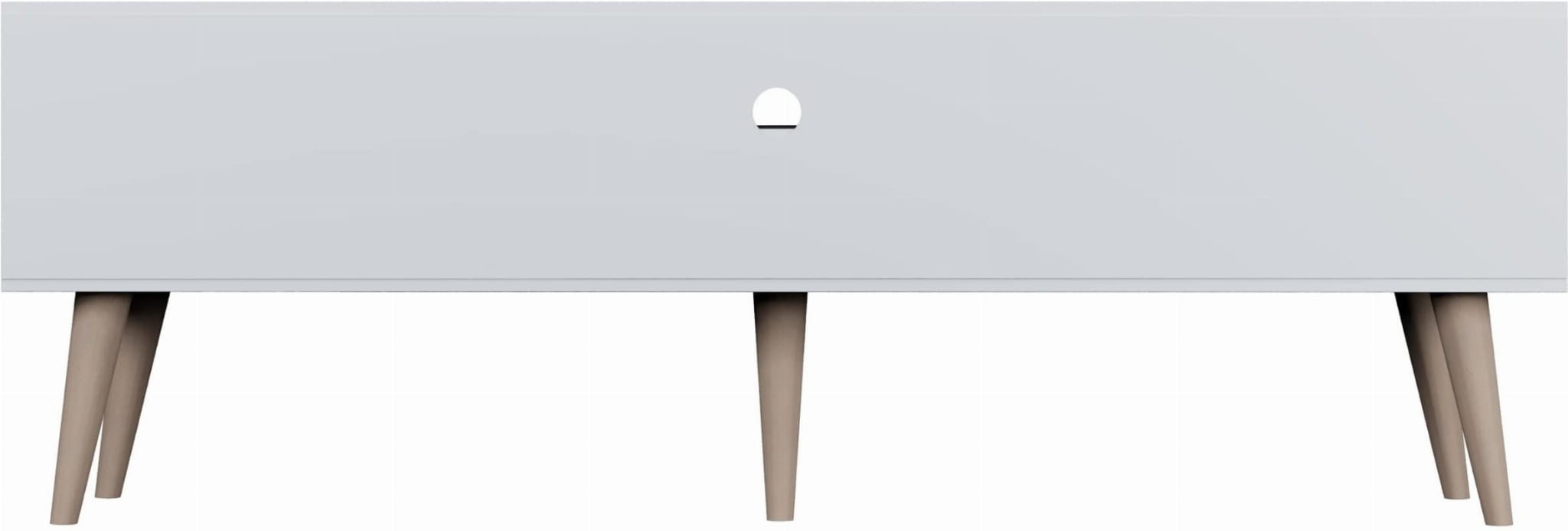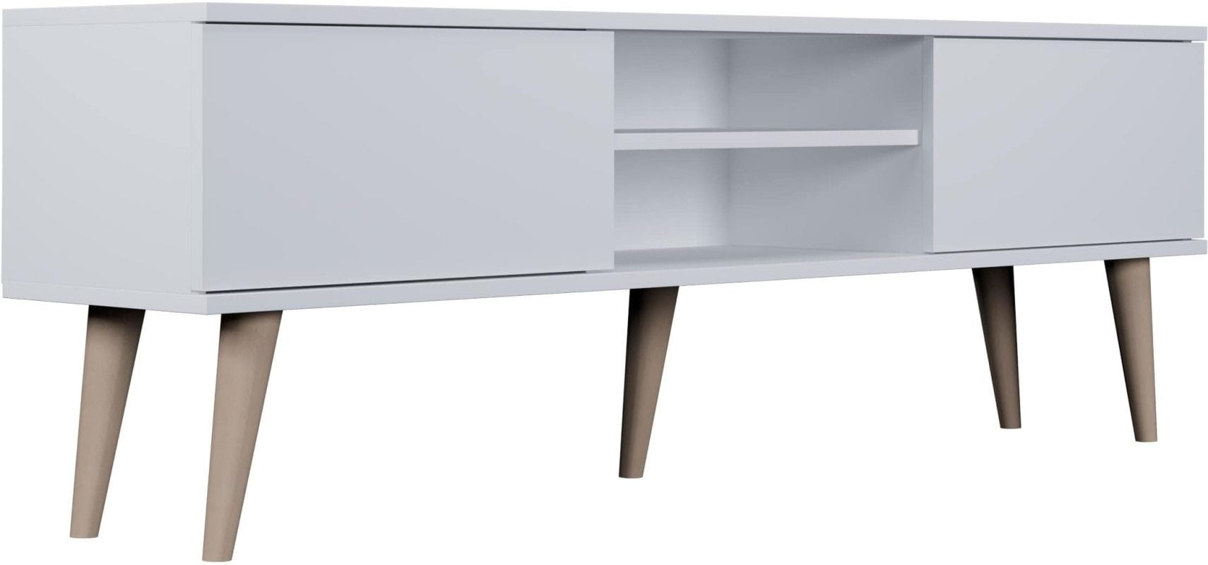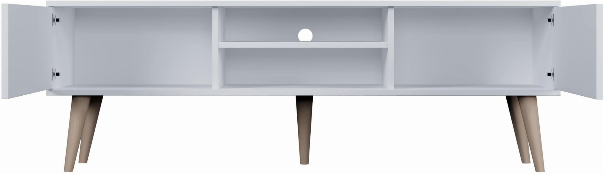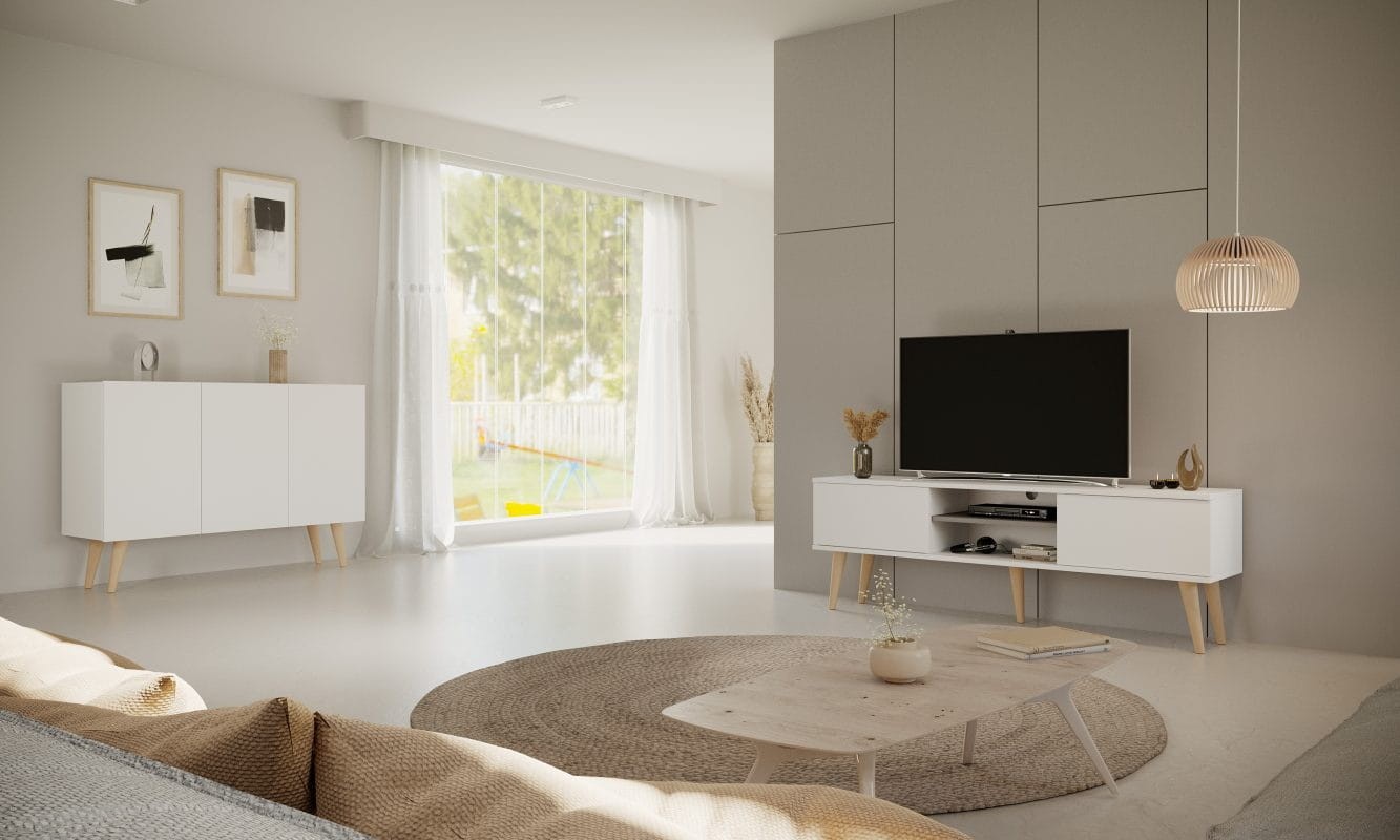 Szafka RTV Toronto do salonu to praktyczny mebel pod telewizor, utrzymany w nowoczesnym skandynawskim designie. Szafka idealnie sprawdzi się w mniejszych lub średnich salonach i pokojach wypoczynkowych. Wyposażona została w dwoje drzwi oraz otwartą przestrzeń z półką, dzięki czemu znajdzie się na niej miejsce na dekoder, konsole czy inne sprzęty. Mebel posiada otwór w tylnej części, przez który z łatwością można poprowadzić kable sprzętu RTV. Szafka stoi na nóżkach o wysokości 25 cm, co ułatwia dbanie o czystość pod meblem.