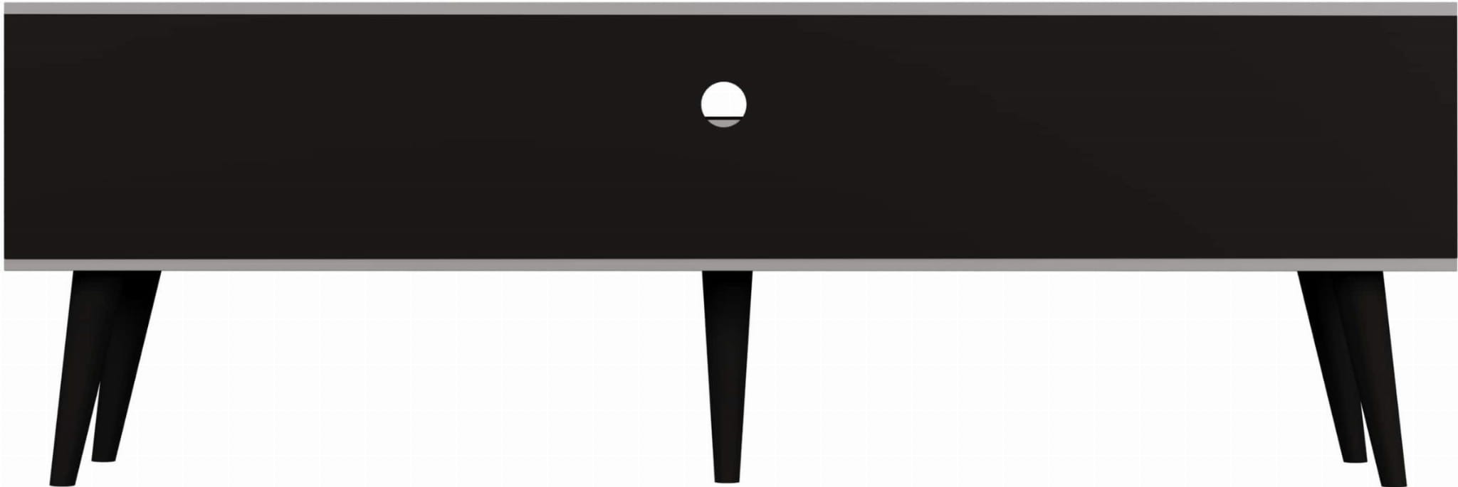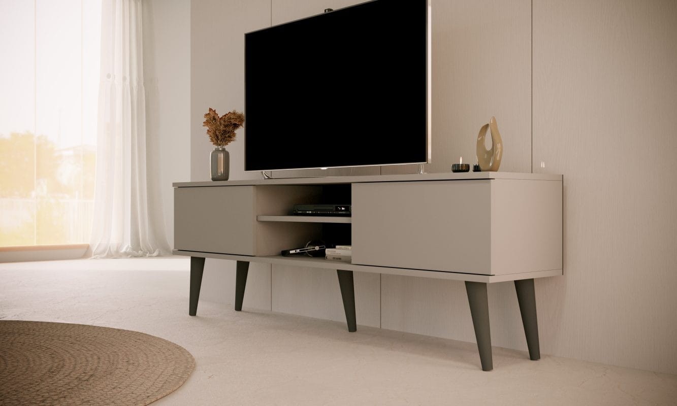 Szafka RTV Toronto do salonu to praktyczny mebel pod telewizor, utrzymany w nowoczesnym skandynawskim designie. Szafka idealnie sprawdzi się w mniejszych lub średnich salonach i pokojach wypoczynkowych. Wyposażona została w dwoje drzwi oraz otwartą przestrzeń z półką, dzięki czemu znajdzie się na niej miejsce na dekoder, konsole czy inne sprzęty. Mebel posiada otwór w tylnej części, przez który z łatwością można poprowadzić kable sprzętu RTV. Szafka stoi na nóżkach o wysokości 25 cm, co ułatwia dbanie o czystość pod meblem.
