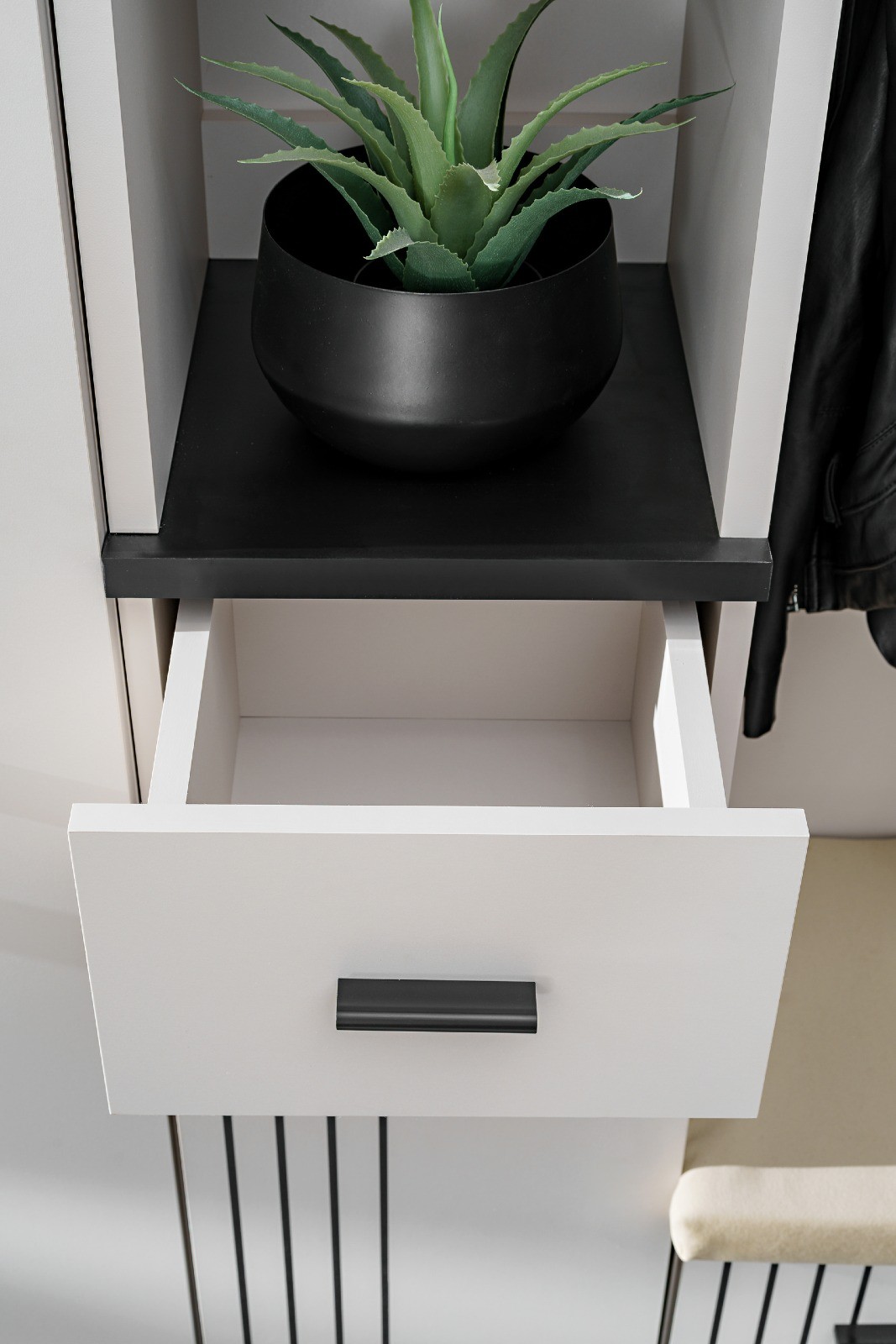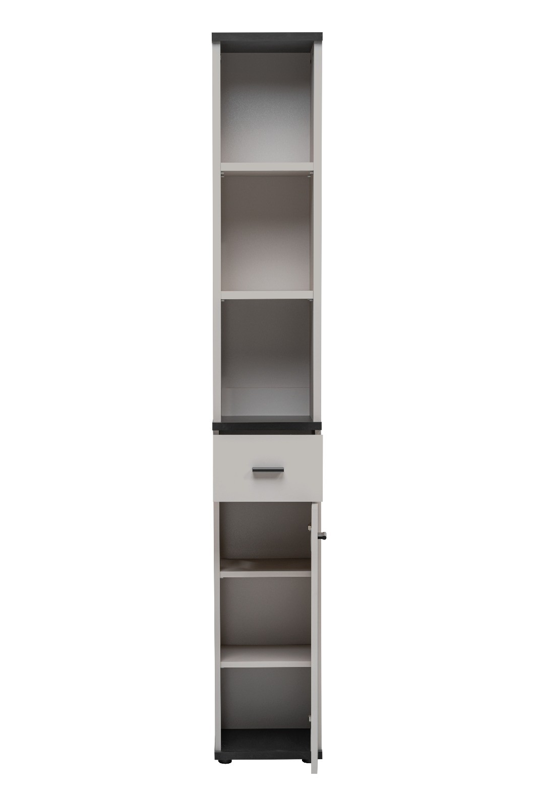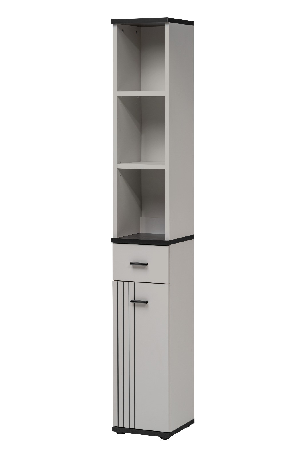 Szafka stojąca Hugo to elegancki mebel, który doskonale uzupełni nowoczesną aranżację salonu lub przedpokoju. Jej smukła sylwetka i modne matowe wykończenie w kolorach cashmere i czerni wprowadzają do wnętrza subtelną elegancję. Przemyślany układ półek i zamkniętej szafki pozwala wygodnie przechowywać zarówno dekoracje, jak i przedmioty codziennego użytku. Wysokiej jakości laminowana płyta meblowa zapewnia trwałość i estetyczny wygląd przez lata.
