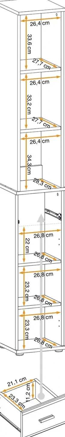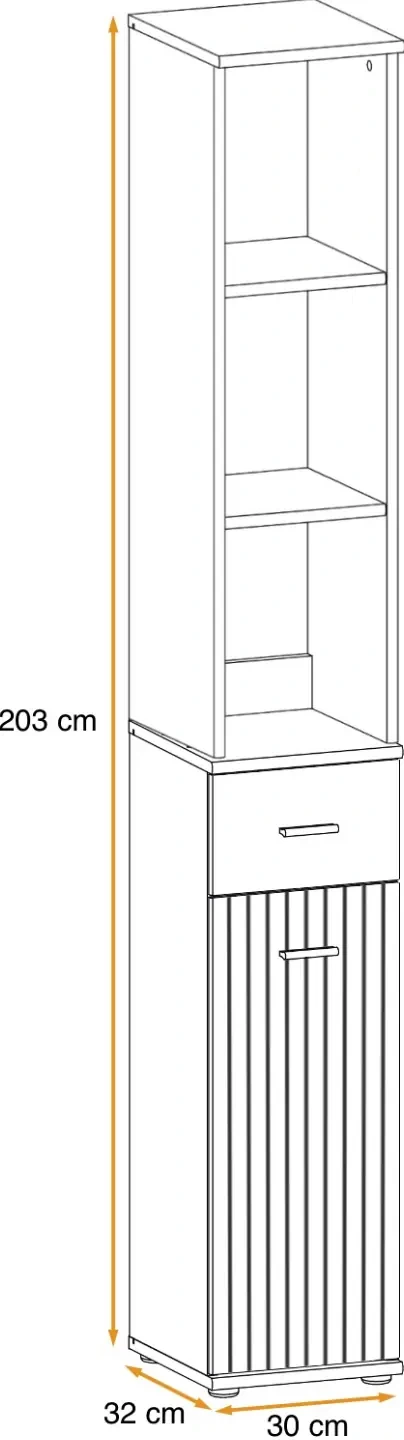 - Optymalne wykorzystanie przestrzeni: Szafka Marco posiada trzy otwarte przestrzenie z półkami, które idealnie nadają się do eksponowania książek, dekoracji czy innych przedmiotów. Dodatkowo, szuflada oferuje praktyczne miejsce na drobne rzeczy, a za zamkniętymi drzwiami znajdują się dwie półki, które pomagają w organizacji większych przedmiotów.