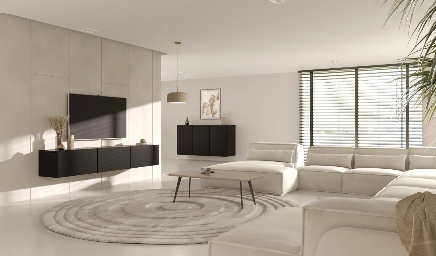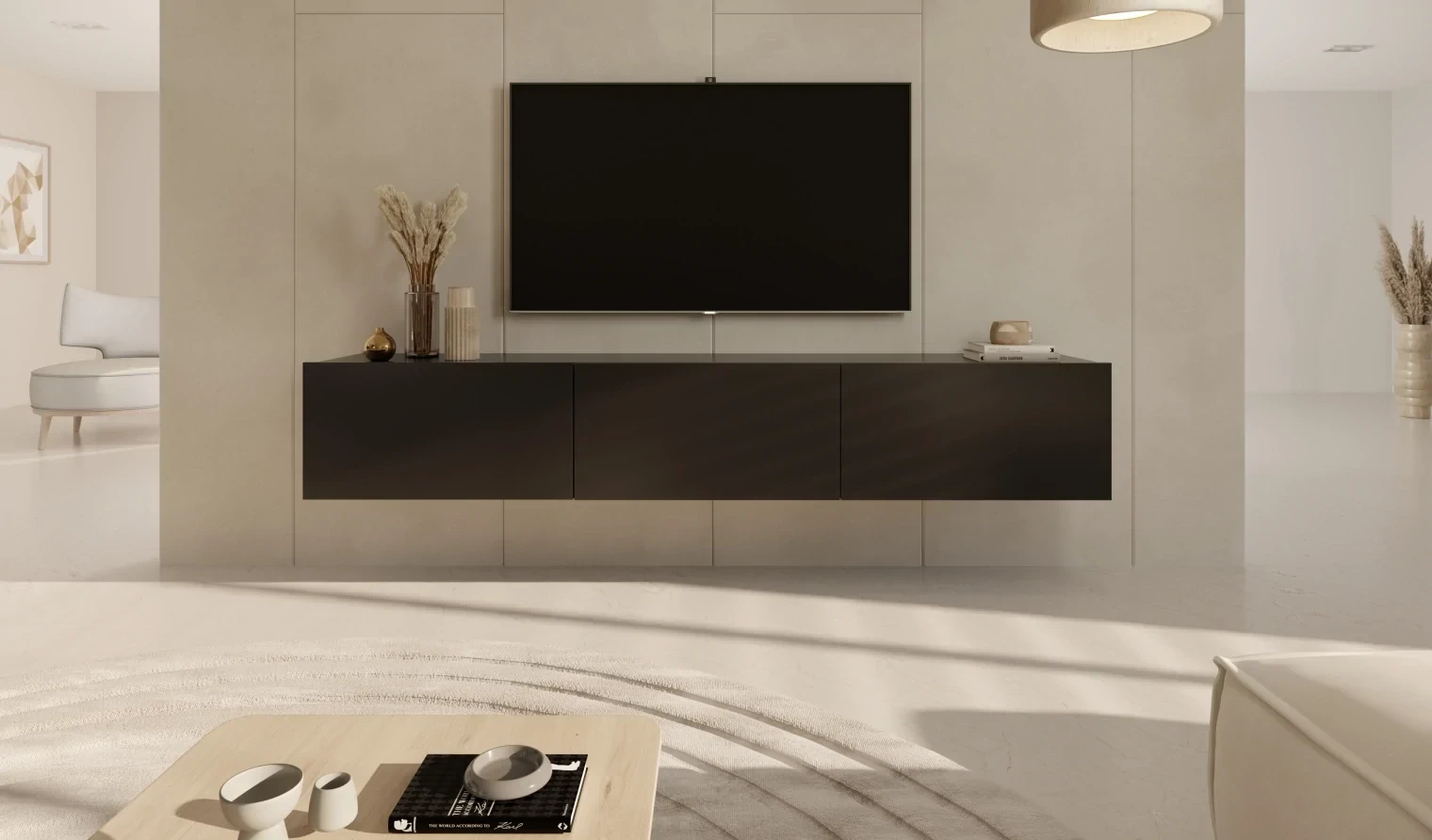 Szafka wisząca RTV Dallas w kolorze czarnym to nowoczesny mebel, który doda wyrafinowanego charakteru każdemu salonowi. Dzięki minimalistycznemu designowi i eleganckiej czerni, szafka idealnie wpasowuje się w różne style wnętrzarskie, od nowoczesnych po industrialne. Szerokość 180 cm zapewnia dużo miejsca na przechowywanie oraz organizację sprzętu RTV, a trzydrzwiowa konstrukcja z opuszczanymi frontami umożliwia łatwy dostęp do przechowywanych przedmiotów. Środkowa szafka wyposażona w otwór na kable umożliwia estetyczne ukrycie przewodów, co dodatkowo podkreśla jej funkcjonalność.