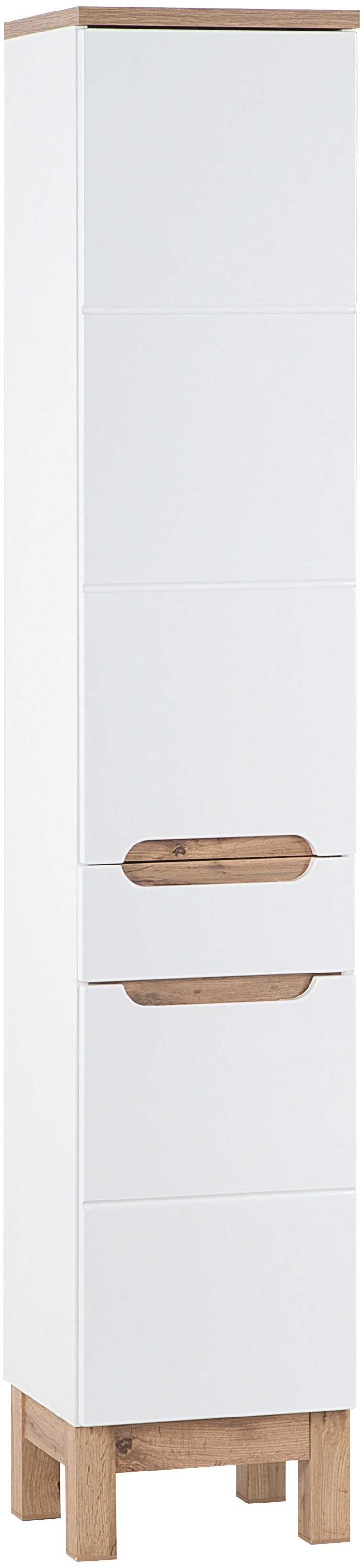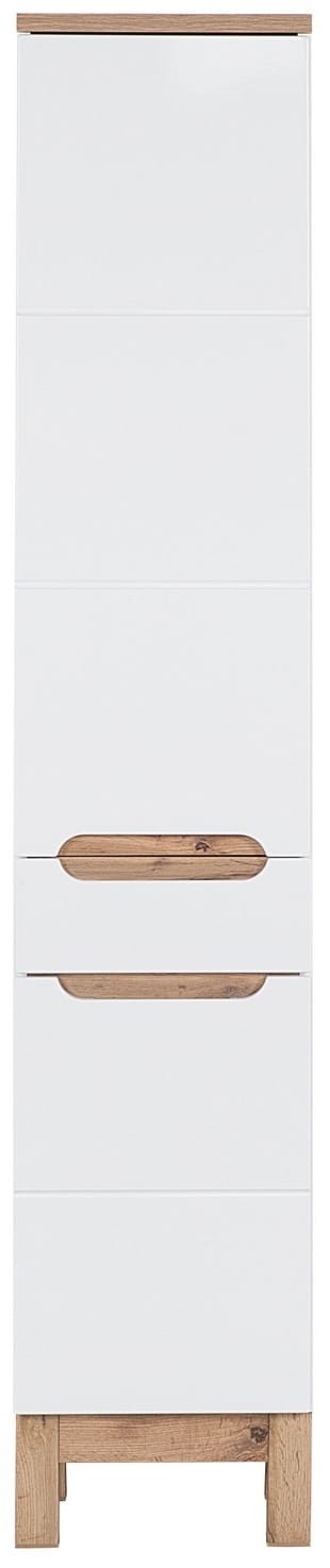Szafka wysoka BALI BIAŁY 800 to stylowa propozycja z kolekcji mebli łazienkowych Bali cechująca się stylową i prosta formą. W kolekcji znajdziemy meble w różnych rozmiarach, dzięki czemu uda się z nich skomponować zestaw pasujący tak do większych jak mniejszych łazienek. Dzięki zastosowaniu białych frontów z MDF, frezowanych uchwytów oraz mechanizmów cichego domyku otrzymujemy kompletny produkt łączący w sobie trwałość, piękno oraz wygodę użytkowania. Detale w kolorze dąb wotan dodają meblom przytulnego uroku. Szafka wysoka BALI BIAŁY 800 z pewnością przypadnie do gustu osobom ceniącym niebanalne rozwiązania.