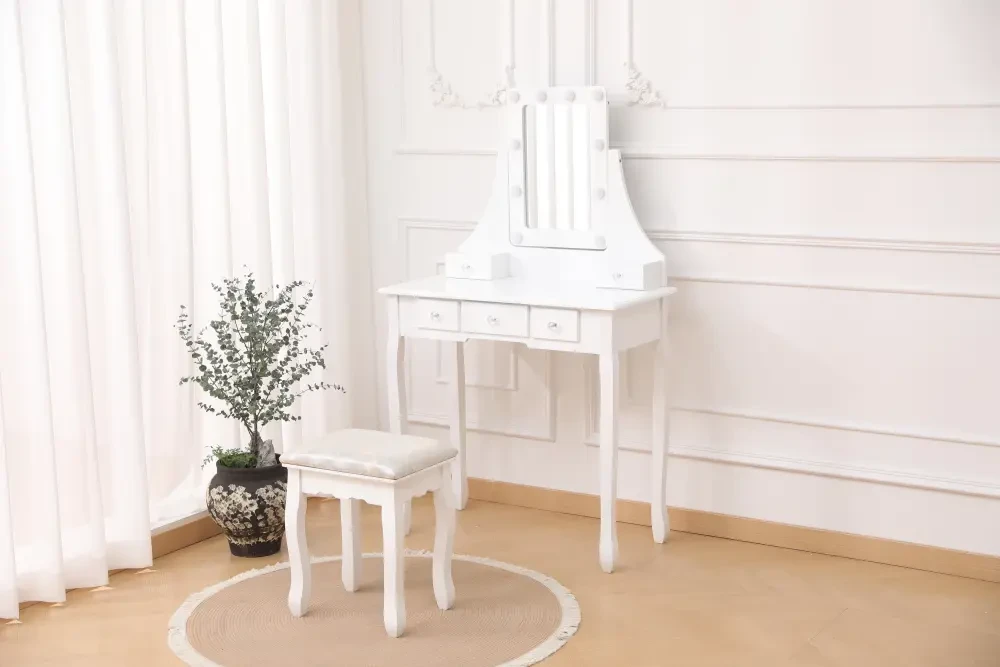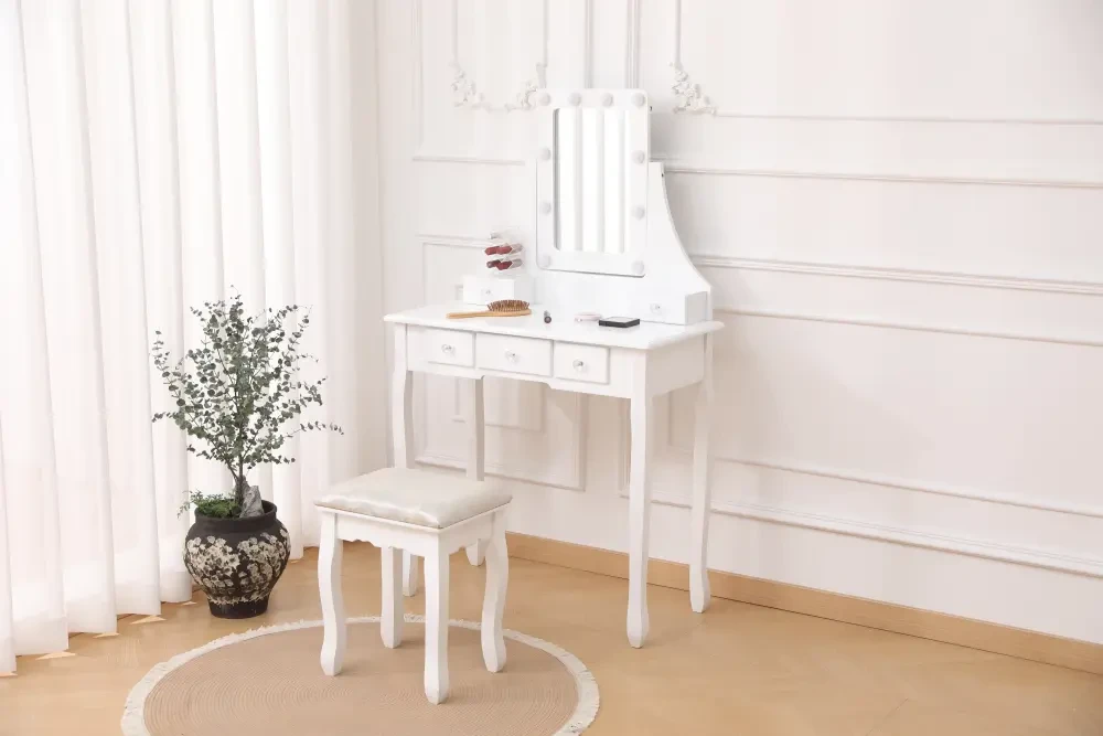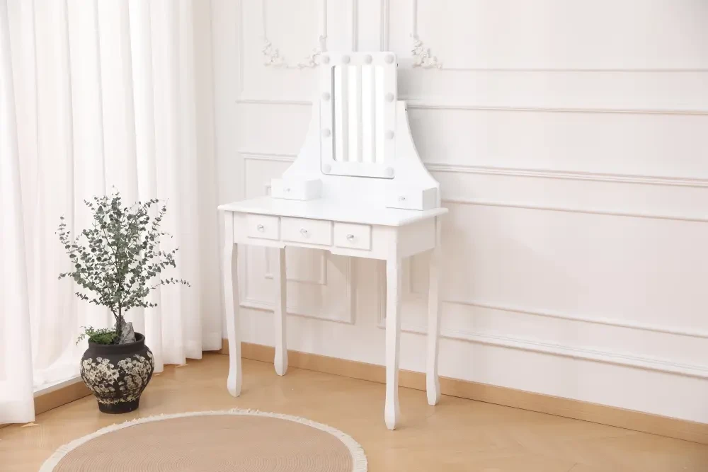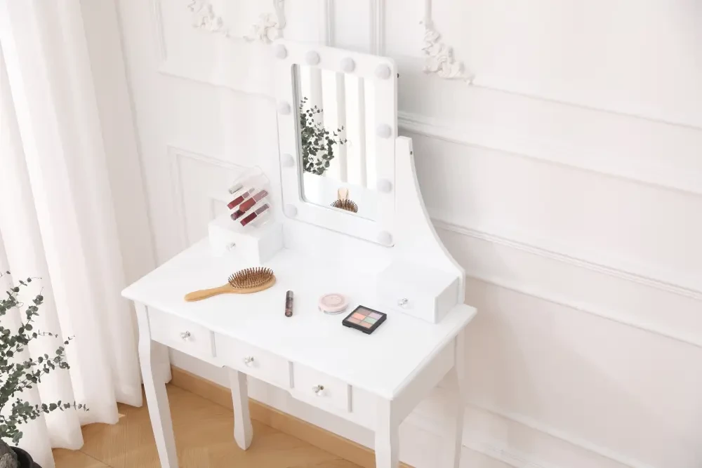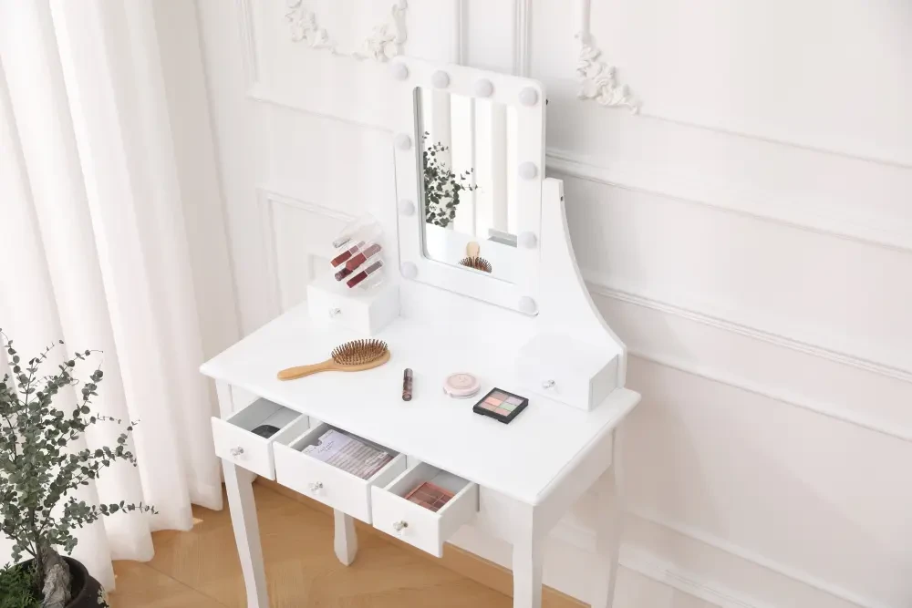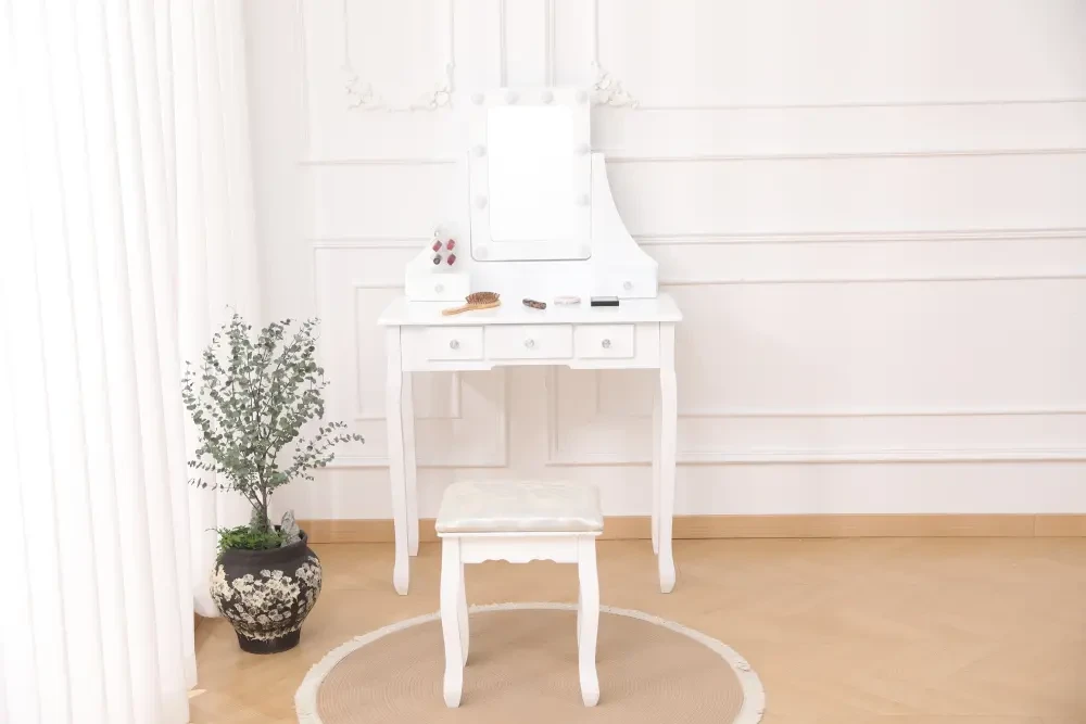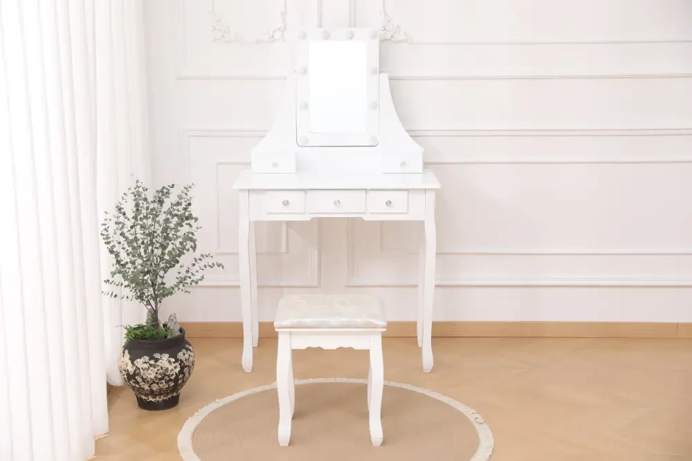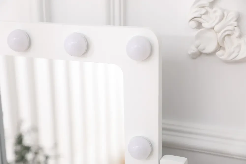 Duże lustro z wbudowanym oświetleniem LED oraz możliwość wyboru barwy światła sprawiają, że toaletka doskonale sprawdzi się zarówno przy makijażu dziennym, jak i wieczorowym. Dodatkowa przestrzeń do przechowywania i dołączony taboret tworzą kompletny, wygodny zestaw.