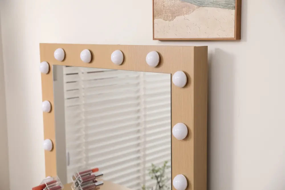 Toaletka DT07 z oświetleniem LED to praktyczny mebel do sypialni lub garderoby, który ułatwia codzienne wykonywanie makijażu i organizację kosmetyków. Duże lustro oraz 3 barwy światła pomagają dopasować oświetlenie do różnych potrzeb i pory dnia.