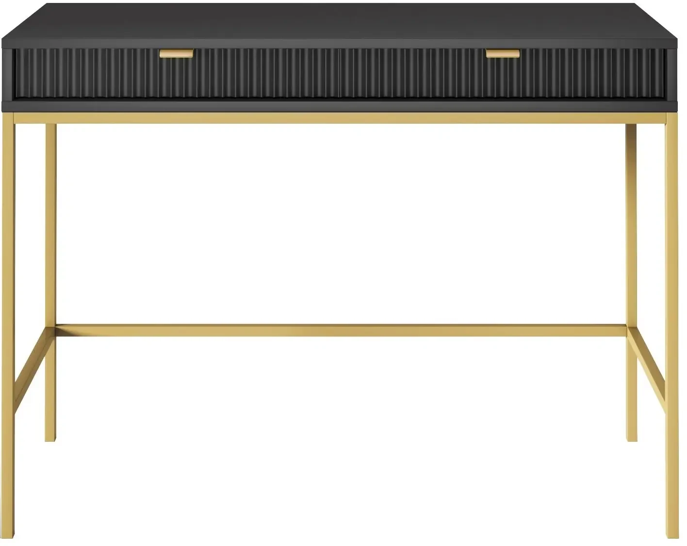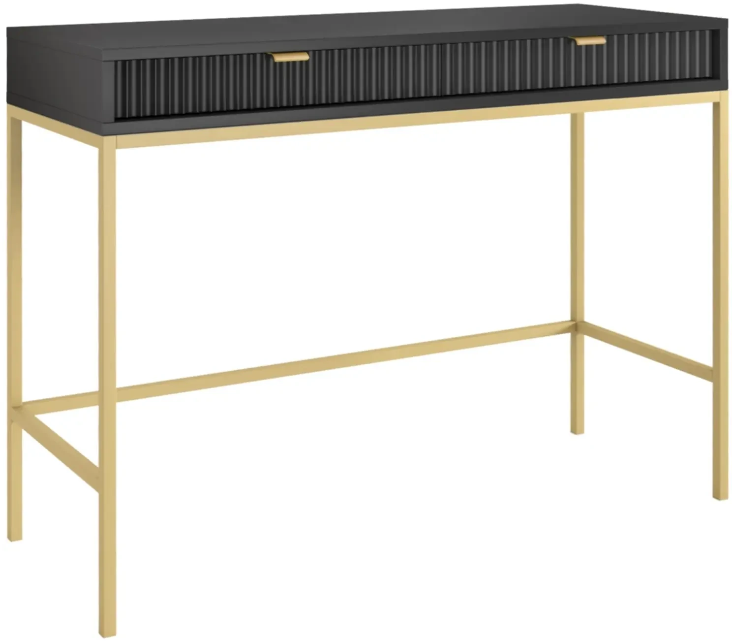 Toaletka Nova, to nowoczesna propozycja mebla do sypialni lub przedpokoju. Toaletka została wyposażona w dwie szuflady, które stanowią doskonałe miejsce do przechowywania kosmetyków, biżuterii lub innych drobiazgów. Nowoczesny, minimalistyczny design połączony z wyrazistym czarnym kolorem sprawia, że toaletka Nova prezentuje się niezwykle stylowo i nowocześnie. Prosta ale elegancka forma z dekoracyjnym ryflowaniem na frontach to must have dla miłośników nowoczesnego designu. Metalowa podstawa nadaje lekkości konstrukcji a całości dopełniają ozdobne uchwyty w kolorze złotym. Mebel został zaprojektowany i wykonany w Polsce co jest gwarancją jakości - Wspieraj