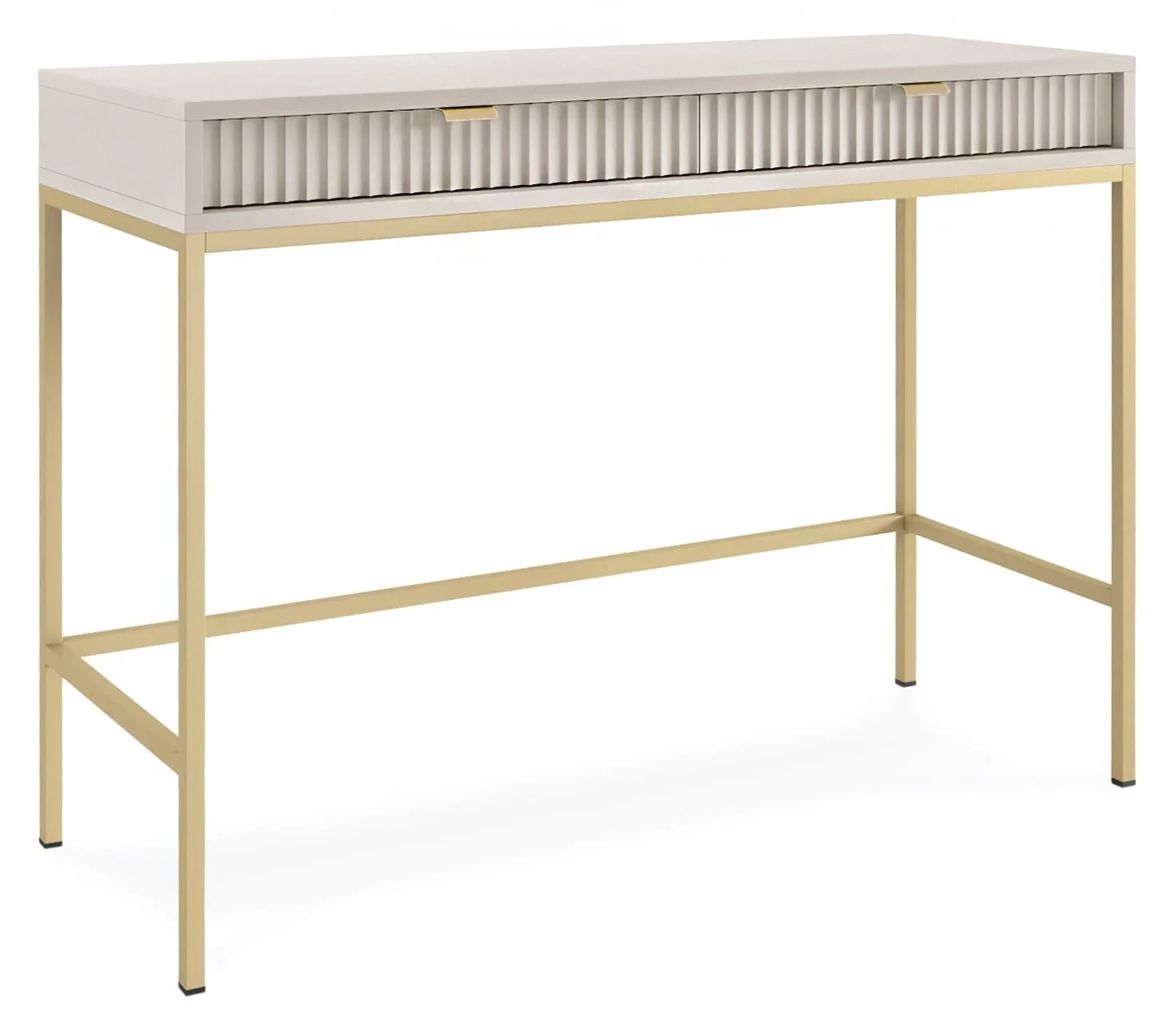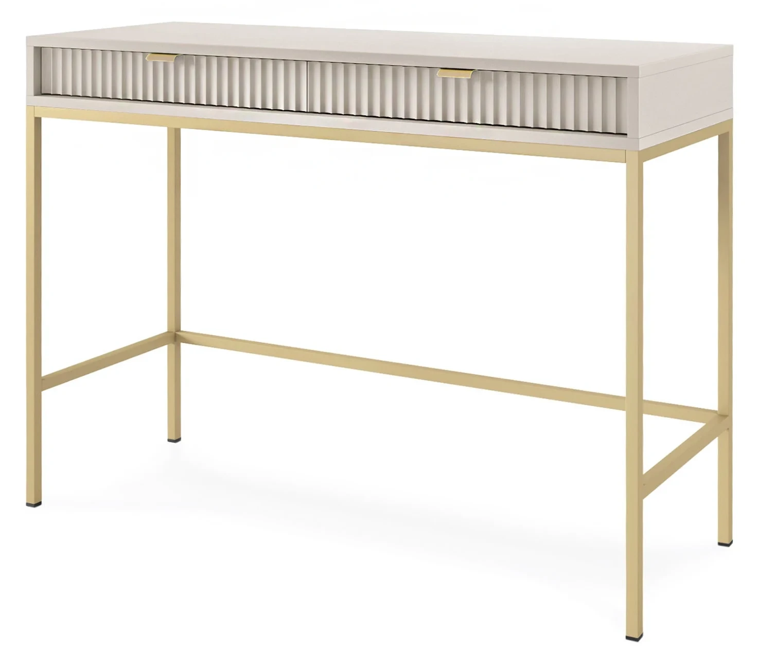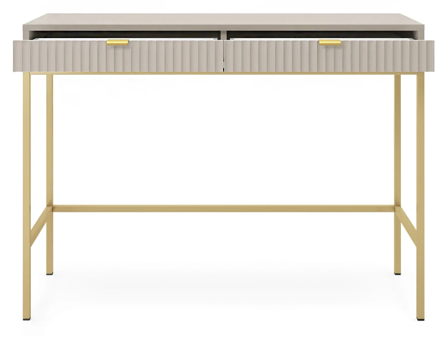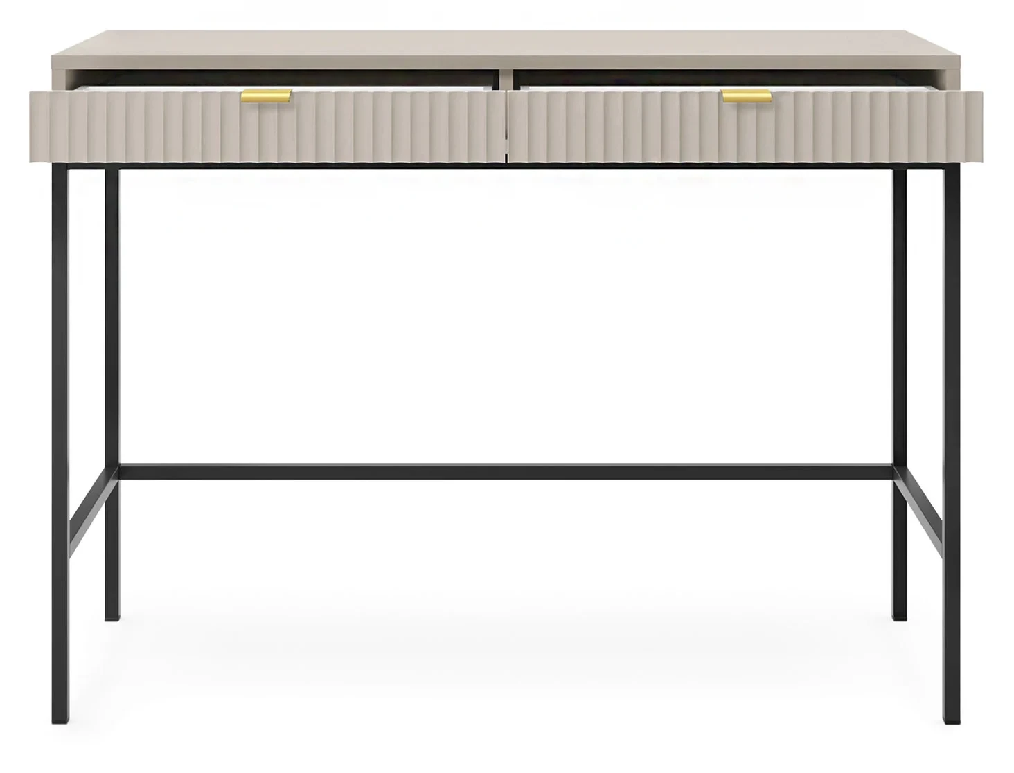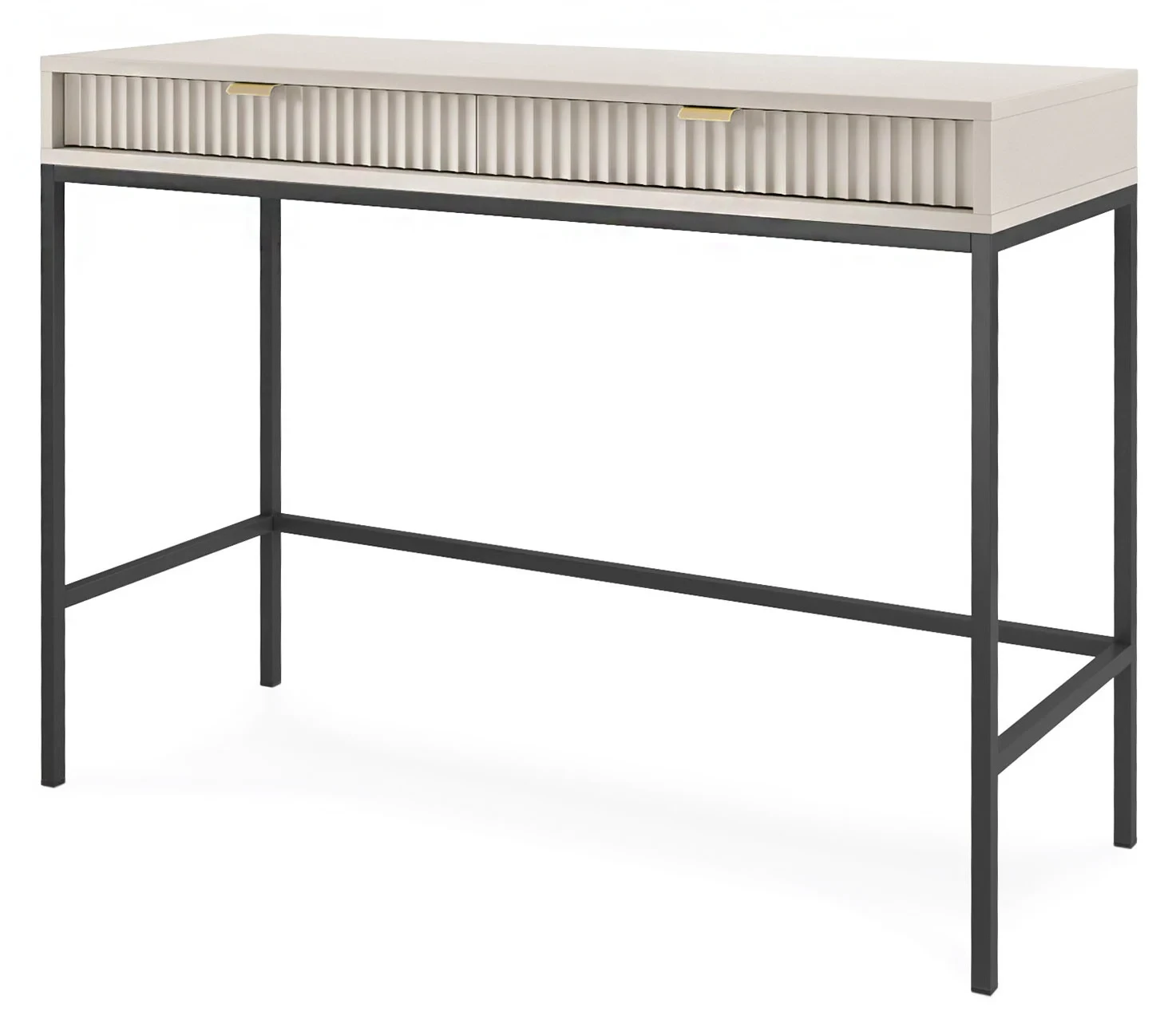 Toaletka Nova, to nowoczesna propozycja mebla do sypialni lub przedpokoju. Toaletka została wyposażona w dwie szuflady, które stanowią doskonałe miejsce do przechowywania kosmetyków, biżuterii lub innych drobiazgów. Nowoczesny, minimalistyczny design połączony z kaszmirowym kolorem sprawia, że toaletka Nova prezentuje się niezwykle stylowo i nowocześnie. Prosta ale elegancka forma z dekoracyjnym ryflowaniem na frontach to must have dla miłośników nowoczesnego designu. Metalowa podstawa nadaje lekkości konstrukcji a całości dopełniają ozdobne uchwyty w kolorze złotym. Mebel został zaprojektowany i wykonany w Polsce co jest gwarancją jakości - Wspieraj