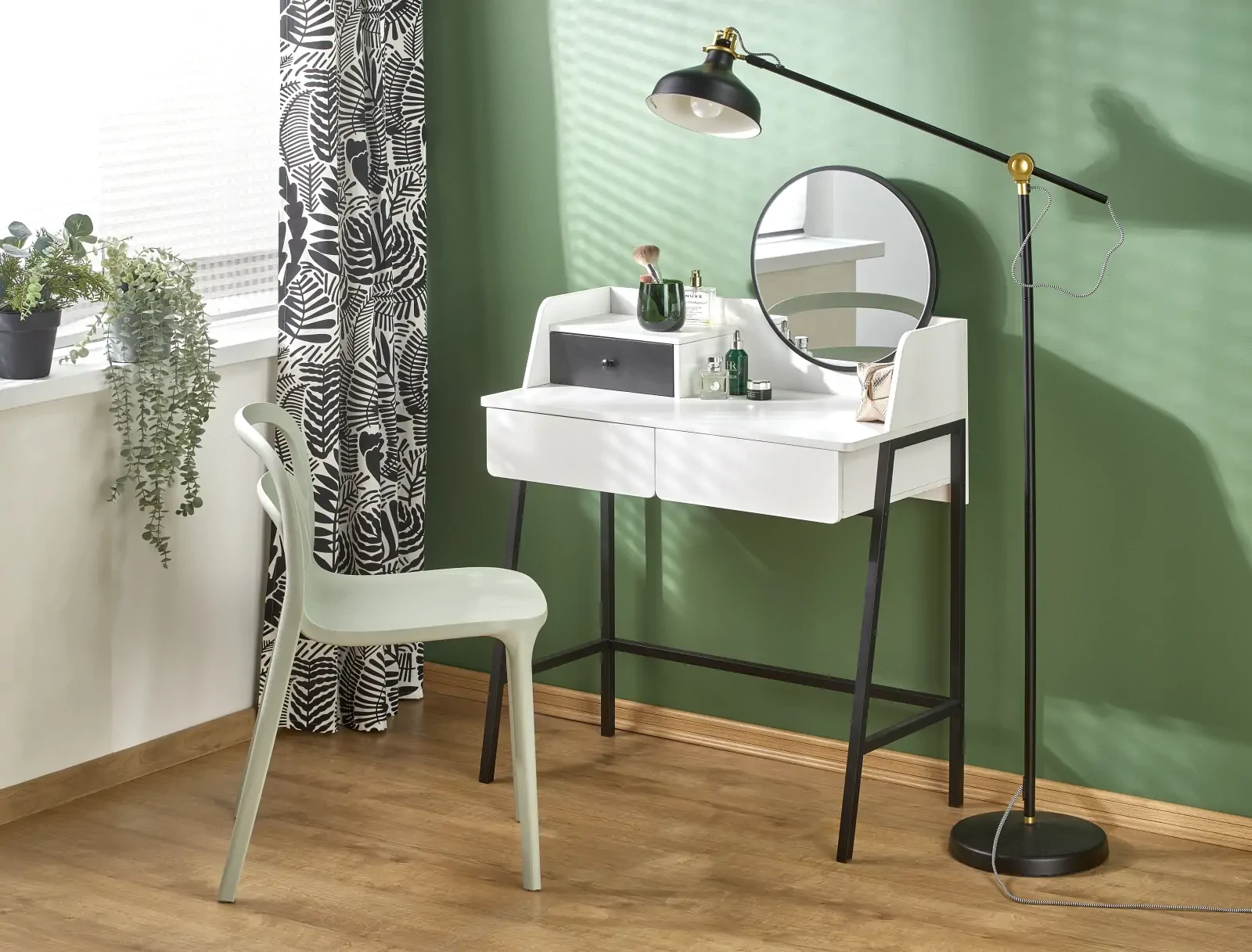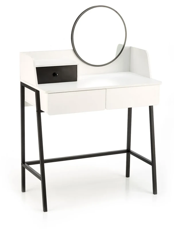 Toaletka AGNES to stylowy i funkcjonalny mebel, który doskonale wpisuje się w nowoczesne i loftowe aranżacje wnętrz. Połączenie bieli z głęboką czernią oraz smukłe, metalowe nogi nadają jej eleganckiego, a zarazem industrialnego charakteru. Przemyślana konstrukcja z dużym, okrągłym lustrem zapewnia wygodę codziennego użytkowania, a praktyczne szuflady i półki umożliwiają zachowanie porządku wśród kosmetyków i dodatków. AGNES łączy w sobie kompaktowe wymiary z wysoką funkcjonalnością, dzięki czemu świetnie sprawdzi się nawet w mniejszych przestrzeniach – sypialni, garderobie czy nowoczesnym przedpokoju. Jej solidna budowa z laminowanej płyty meblowej oraz metalowe elementy gwarantują trwałość na lata, a nowoczesna forma nada wnętrzu stylowego wyrazu. To nie tylko mebel użytkowy, ale także designerski dodatek, który przyciąga wzrok i podnosi estetykę przestrzeni.