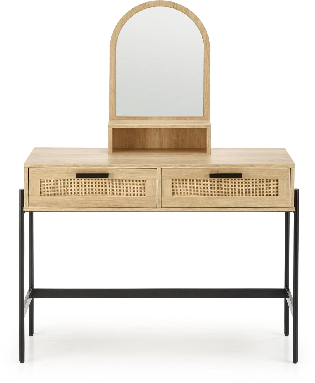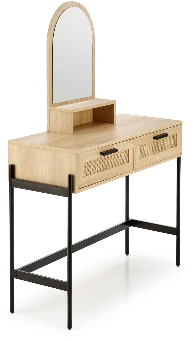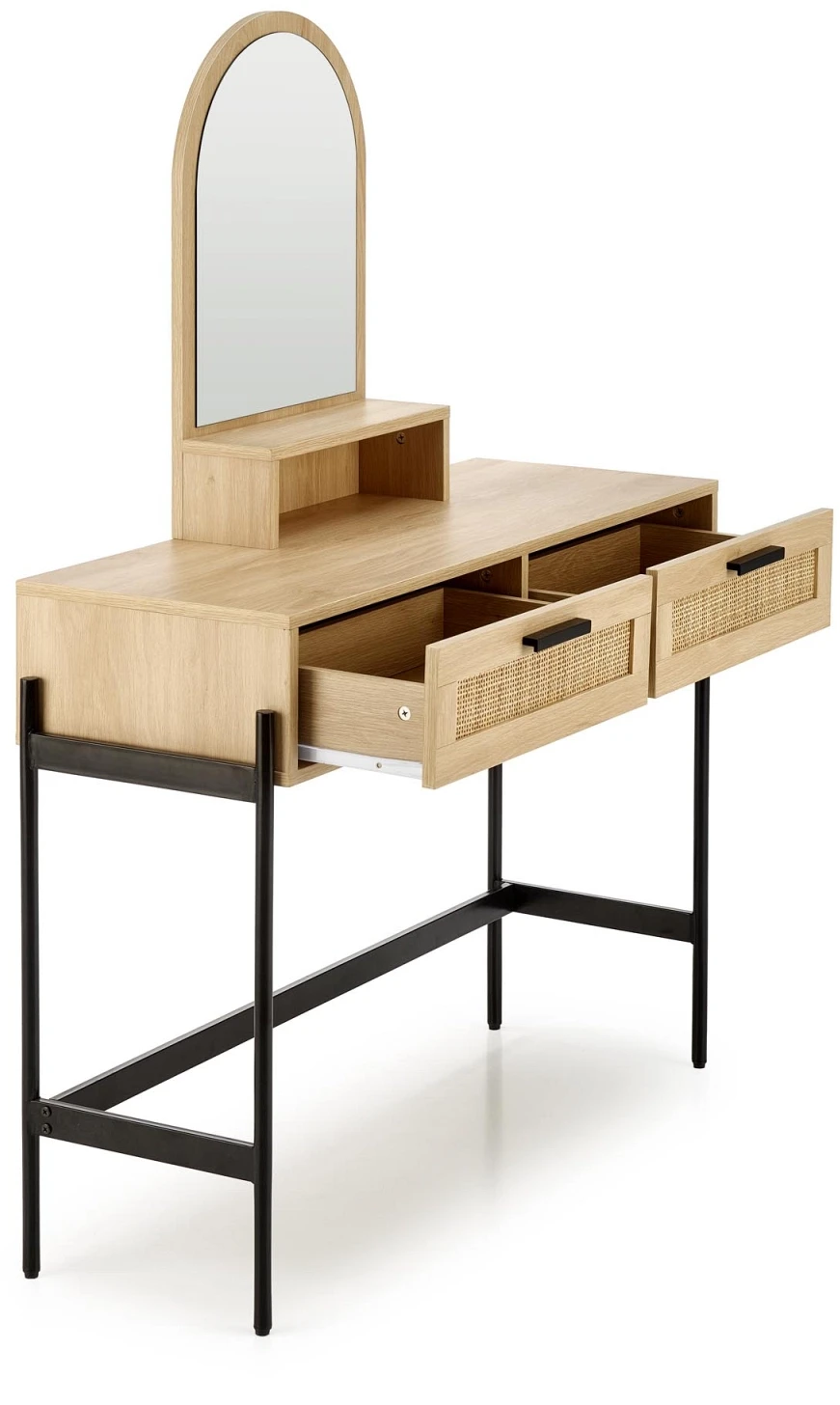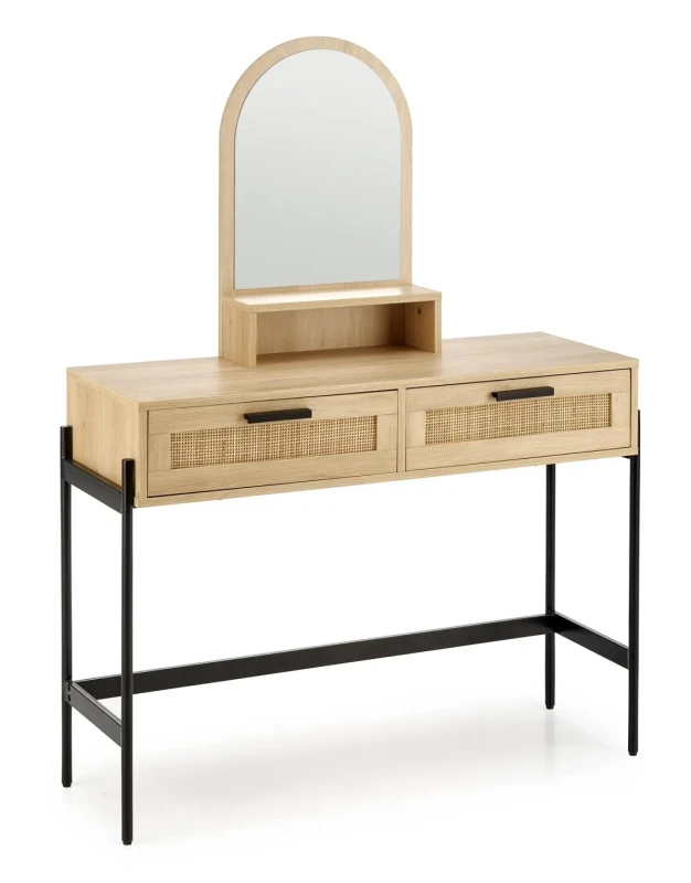 Toaletka CARMEN to propozycja, która łączy w sobie estetykę stylu boho z nowoczesnym minimalizmem. Idealna do sypialni, garderoby lub przedpokoju – nie tylko ułatwi codzienną pielęgnację, ale też wzbogaci wnętrze o designerski akcent. Jej największym atutem jest praktyczne lustro w zaokrąglonej ramie, które optycznie powiększa przestrzeń i dodaje jej lekkości. Dwie pojemne szuflady z frontami z naturalnego rattanu to nie tylko funkcjonalne miejsce na kosmetyki i dodatki, ale również wyjątkowy detal, który podkreśla naturalny charakter mebla. Całość wsparta jest na solidnej, metalowej konstrukcji malowanej proszkowo, co gwarantuje stabilność i trwałość przez długie lata. CARMEN to nie tylko toaletka – to dekoracyjny element wystroju, który wnosi do wnętrza harmonię i przytulność.