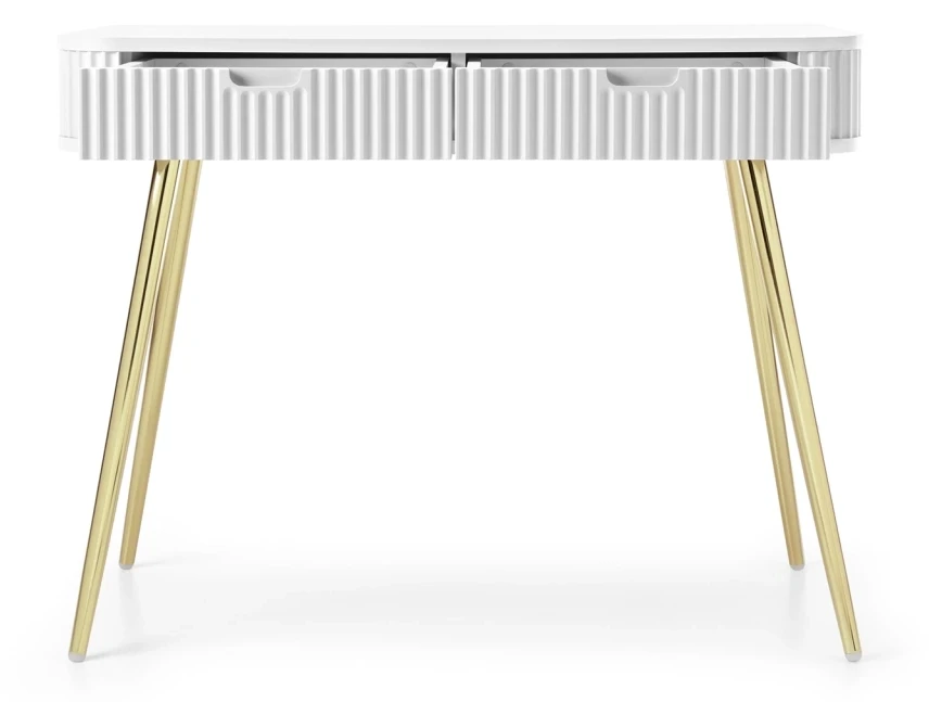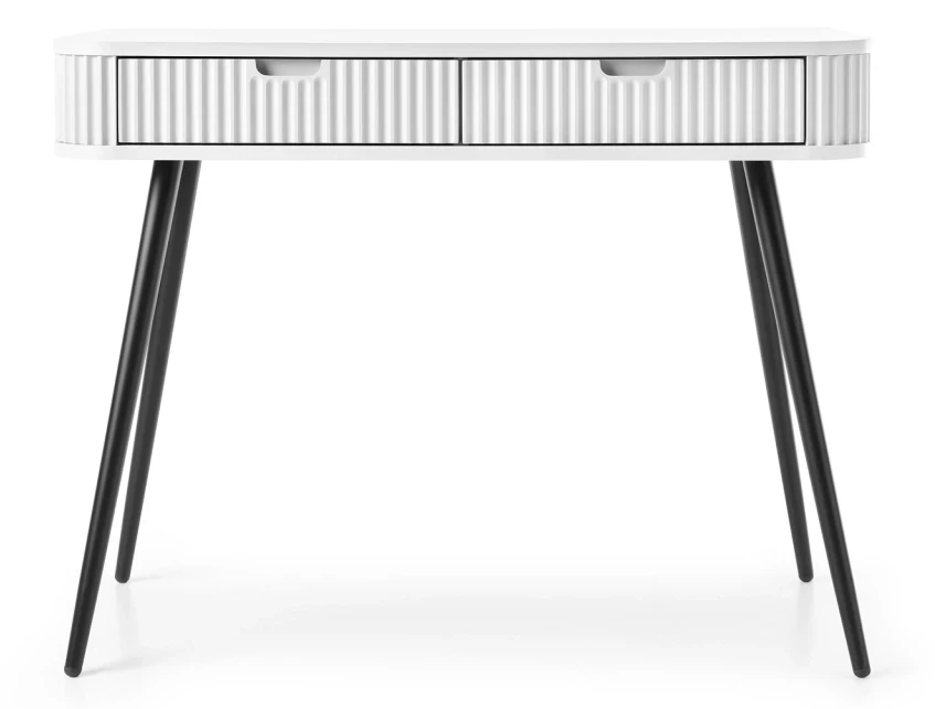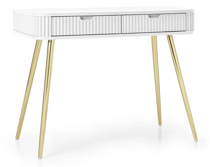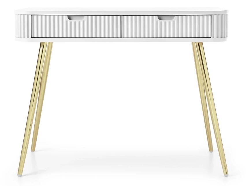 Toaletka Zova to bardzo praktyczny mebel w nowoczesnym stylu. Toaletka Zova została wyposażona w dwie szuflady, dzięki czemu stanowi idealne miejsce do przechowywania rzeczy. Toaletka Zova sprawdzi się zarówno w nowoczesnym salonie czy sypialni, jak też w bardziej klasycznym wnętrzu. Nowoczesny, minimalistyczny design połączony z frezowanymi frontami sprawia, że toaletka Zova prezentuje się niezwykle stylowo i elegancko. Istnieje możliwość wyboru nóżek w kolorze czarnym lub złotym, dzięki czemu jest możliwość dopasowania komody do swojego wnętrza. Mebel został zaprojektowany i wykonany w Polsce co jest gwarancją jakości - Wspieraj