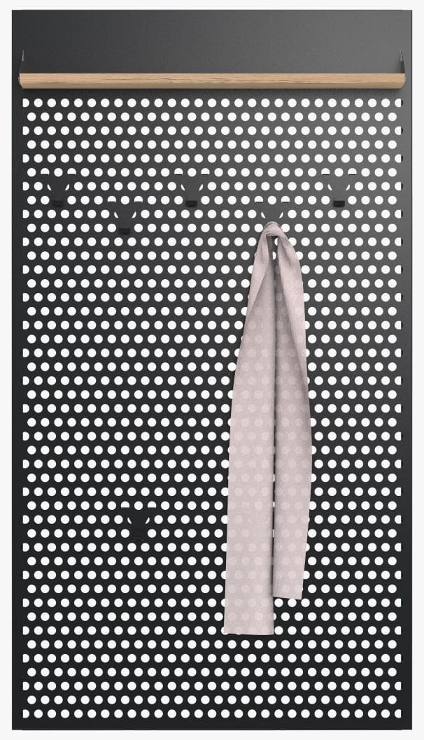 Loft 2W to praktyczny i trwały wieszak na ubrania do przedpokoju. Prezentowany model wieszaka został stworzony po to, żeby dzięki jego kompaktowym wymiarom zaoszczędzić miejsce w przedpokoju oraz pozwolić na funkcjonalne zagospodarowanie przestrzeni w niewielkich i wąskich pomieszczeniach zachowując pełnię funkcjonalności. Mebel wyposażony został siedem haczyków do wieszania ubrań czy torebek oraz funkcjonalną półkę. Wieszak został wykonany z metalu i polakierowany lakierem strukturalnym na kolor czarny, a półka z płyty laminowanej w kolorze Dąb wotan. Kolekcja Loft zawiera lekkie i minimalistyczne bryły, które odnajdą się w każdym przedpokoju w stylu nowoczesnym, industrialnym, lofotwym.