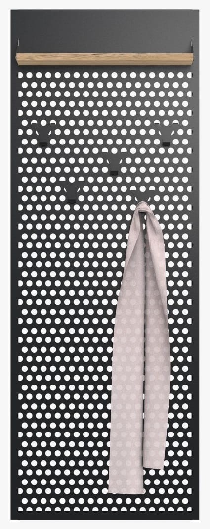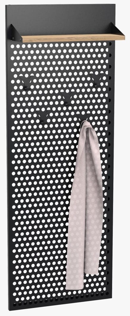 Loft 1W to praktyczny i trwały wieszak na ubrania do przedpokoju. Prezentowany model wieszaka został stworzony po to, żeby dzięki jego kompaktowym wymiarom zaoszczędzić miejsce w przedpokoju oraz pozwolić na funkcjonalne zagospodarowanie przestrzeni w niewielkich i wąskich pomieszczeniach zachowując pełnię funkcjonalności. Mebel wyposażony został pięć haczyków do wieszania ubrań czy torebek oraz funkcjonalną półkę. Wieszak został wykonany z metalu i polakierowany lakierem strukturalnym na kolor czarny, a półka z płyty laminowanej w kolorze Dąb wotan. Kolekcja Loft zawiera lekkie i minimalistyczne bryły, które odnajdą się w każdym przedpokoju w stylu nowoczesnym, industrialnym, lofotwym.