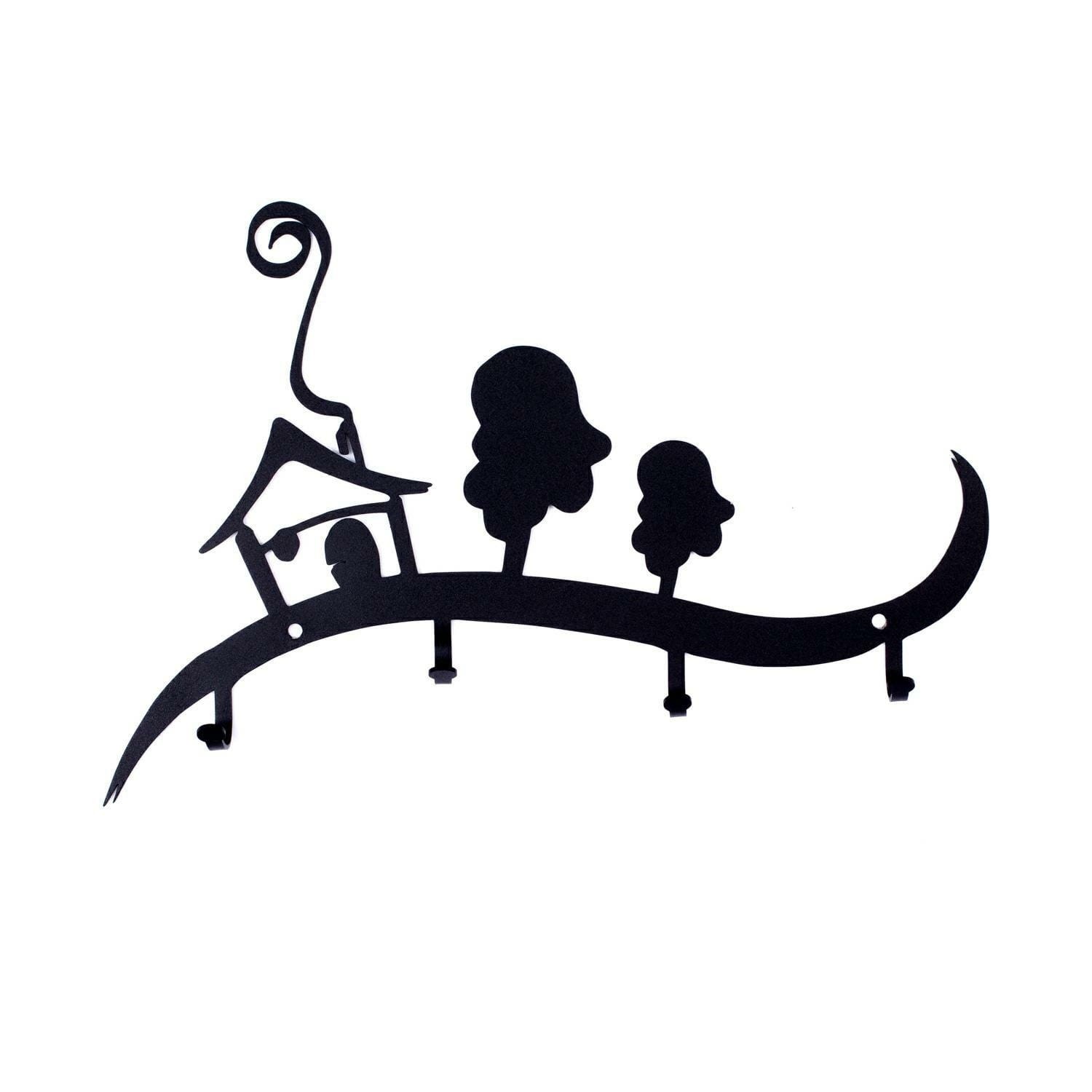 Wieszak ścienny Domek jest idealnym rozwiązaniem do przedpokoju. Stylowy wieszak z motywem domku oraz drzew ociepli każde wnętrze i pomoże stworzyć przyjazną atmosferę mieszkania. Wycinane laserowo elementy wieszaka są bardzo trwałe, odporne na zarysowania oraz zabrudzenia. Na pofalowanej listwie wieszaka zostały umieszczone 4 haki, o obciążeniu 3 kg każdy, na których można powiesić klucze, torebki lub kurtki. Listwa dostępna jest w dwóch kolorach. Maksymalne obciążenie listwy to 12 kg. Do wieszaka załączany jest zestaw montażowy, który składa się z kołków, zaślepek i śrubek.