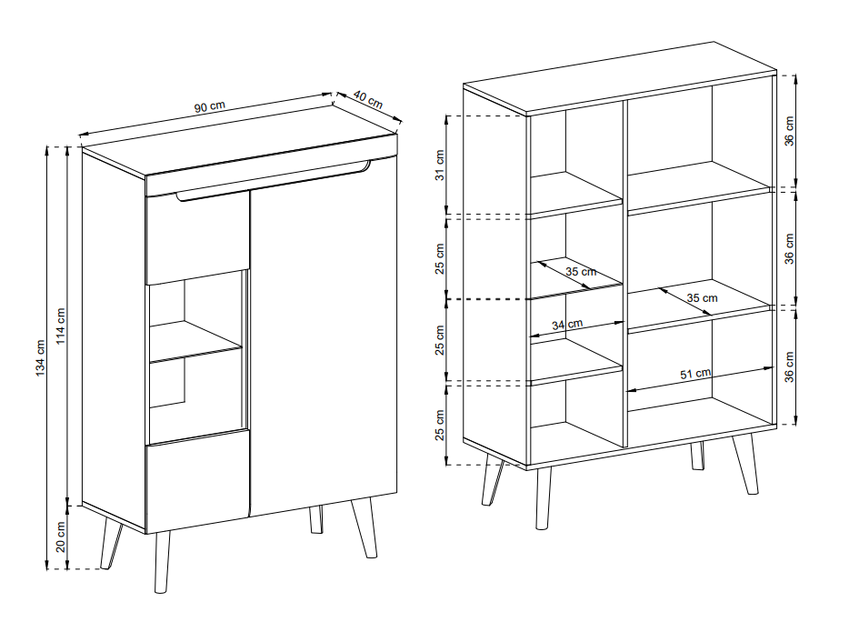 - Wysokość szafki: 134 cm (razem z nóżkami)