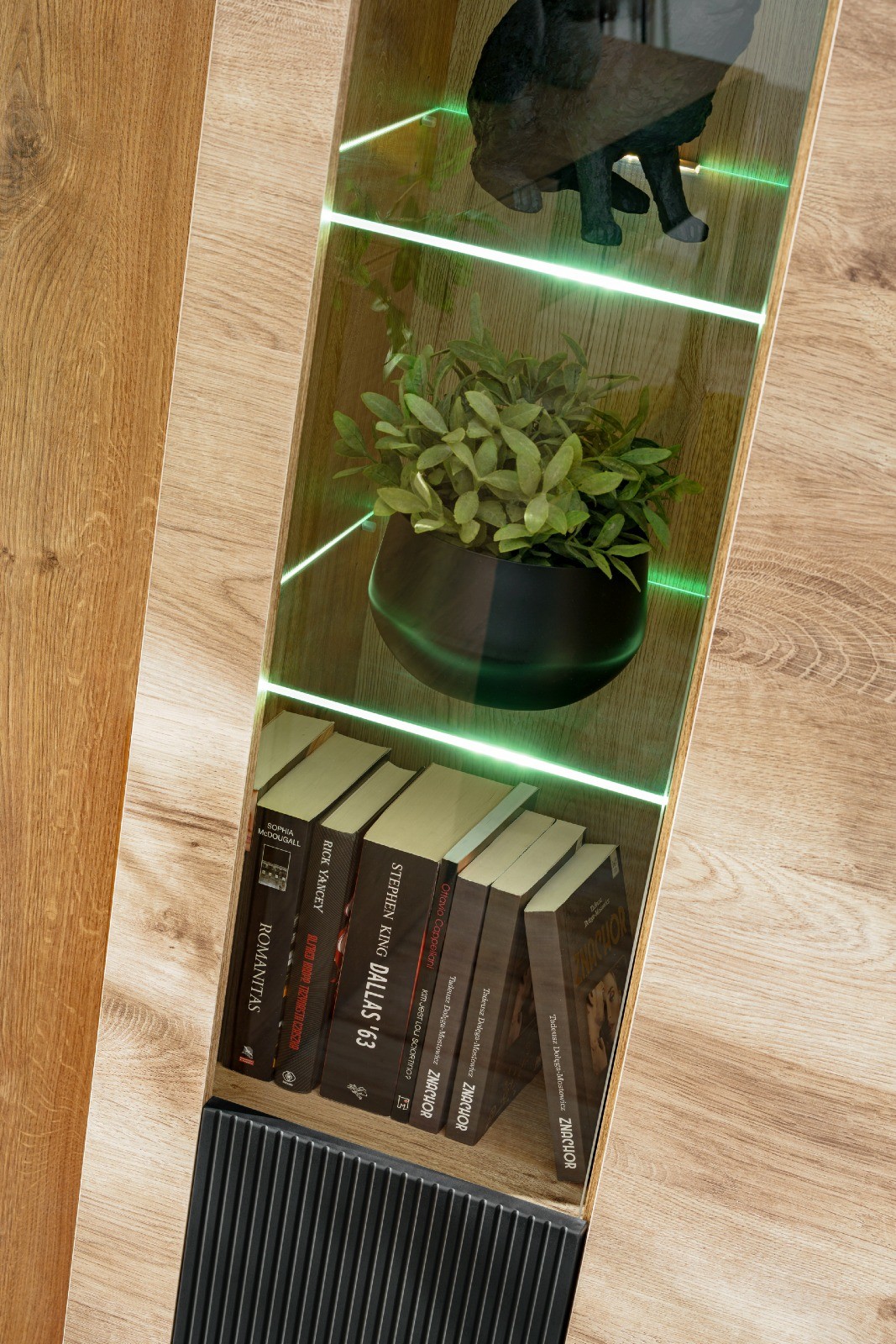 - Oświetlenie LED: witryna posiada przeszkloną część z podświetleniem LED