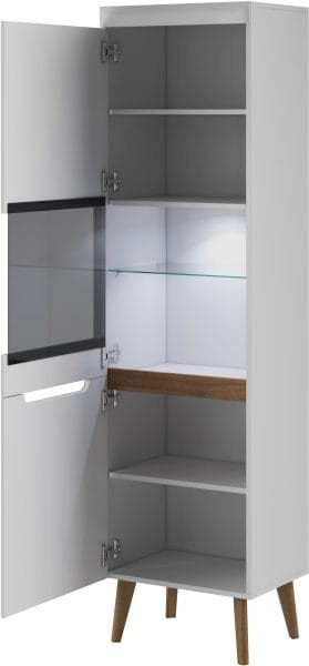 Witryna Nordi to praktyczny mebel w nowoczesnym stylu. Witryna została wyposażona w pojemne półki, które pomieszczą sporo ubrań lub innych podręcznych rzeczy z kolei przeszklona półka to doskonałe miejsce na wyeksponowanie pamiątek, zdjęć czy dekoracji. Opcjonalnie istnieje możliwość dokupienia oświetlenia, które podkreśli charakter mebla. Nowoczesny, minimalistyczny design połączony z delikatnym kolorem bieli sprawia, że witryna Nordi prezentuje się niezwykle stylowo i nowocześnie. Mebel został zaprojektowany i wykonany w Polsce co jest gwarancją jakości - Wspieraj