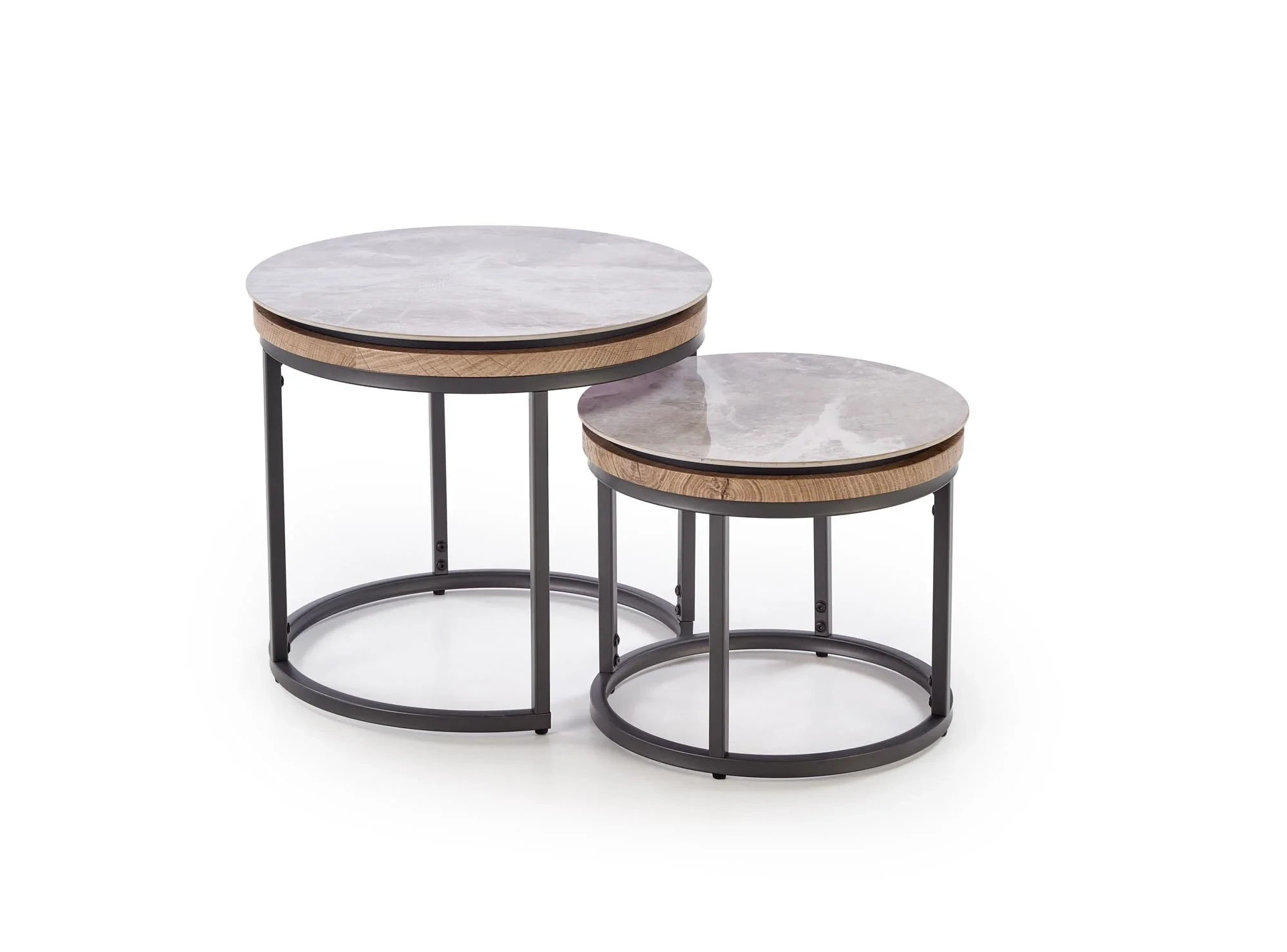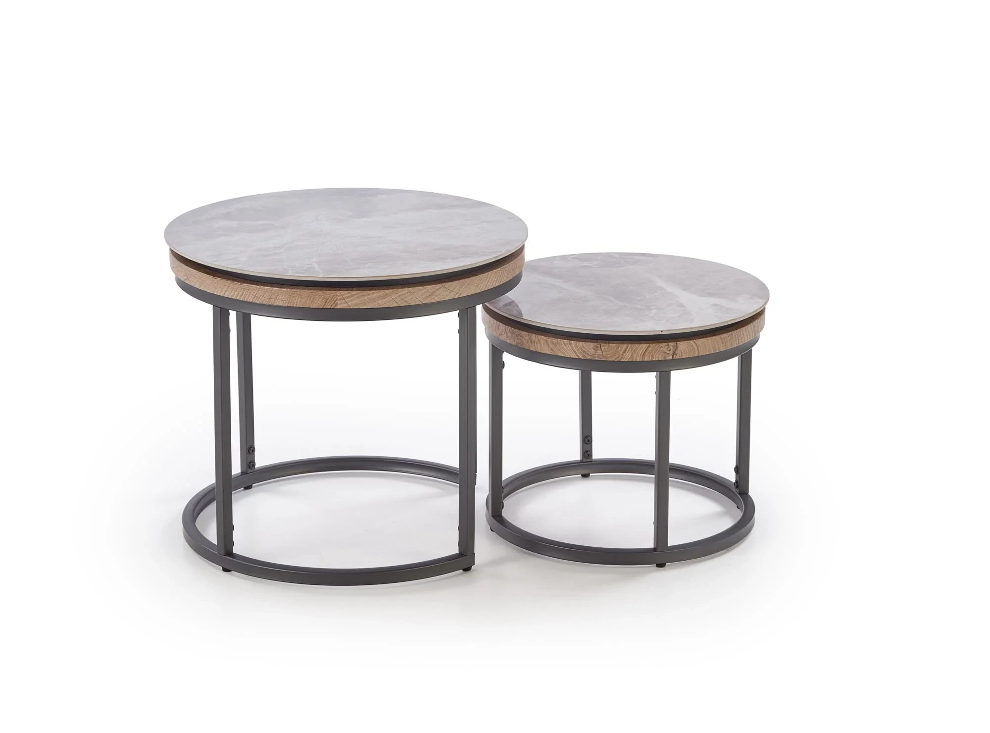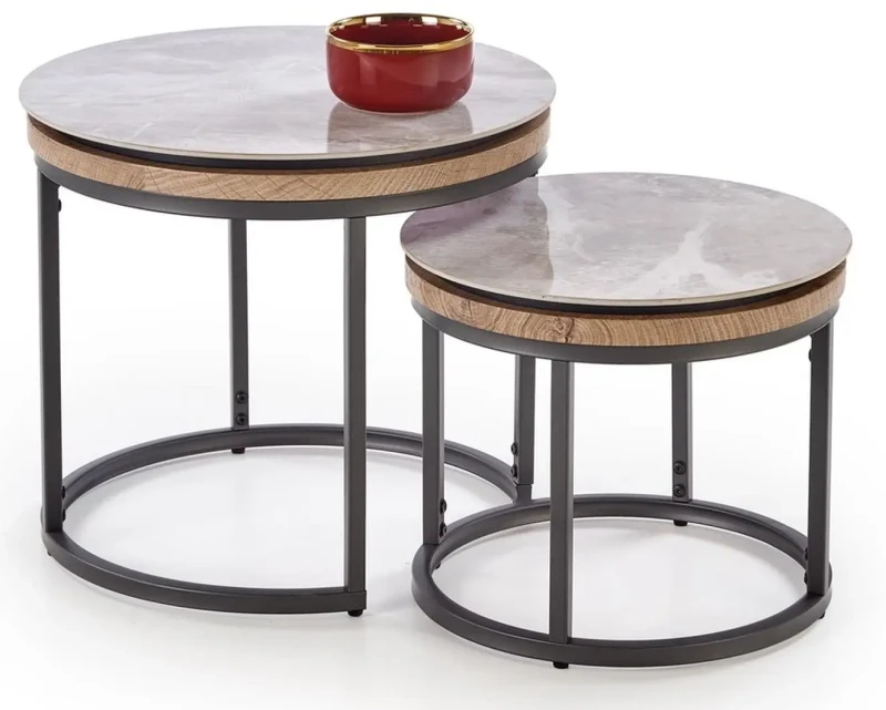 Dwa stoliki o różnych wymiarach można ustawić razem lub osobno, dopasowując je do aktualnych potrzeb. Solidne materiały i dopracowane detale sprawiają, że zestaw prezentuje się lekko, a jednocześnie stabilnie i nowocześnie.