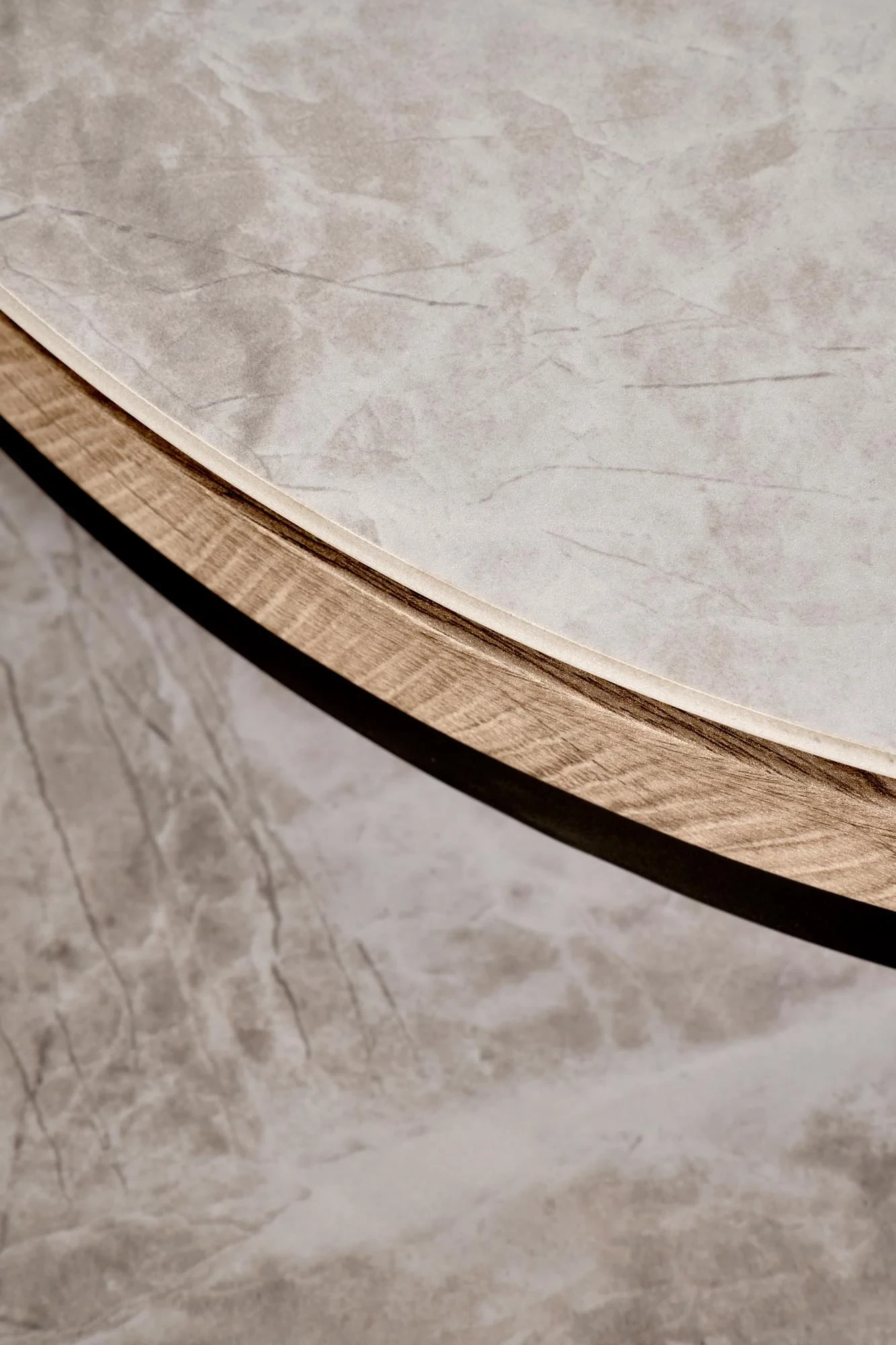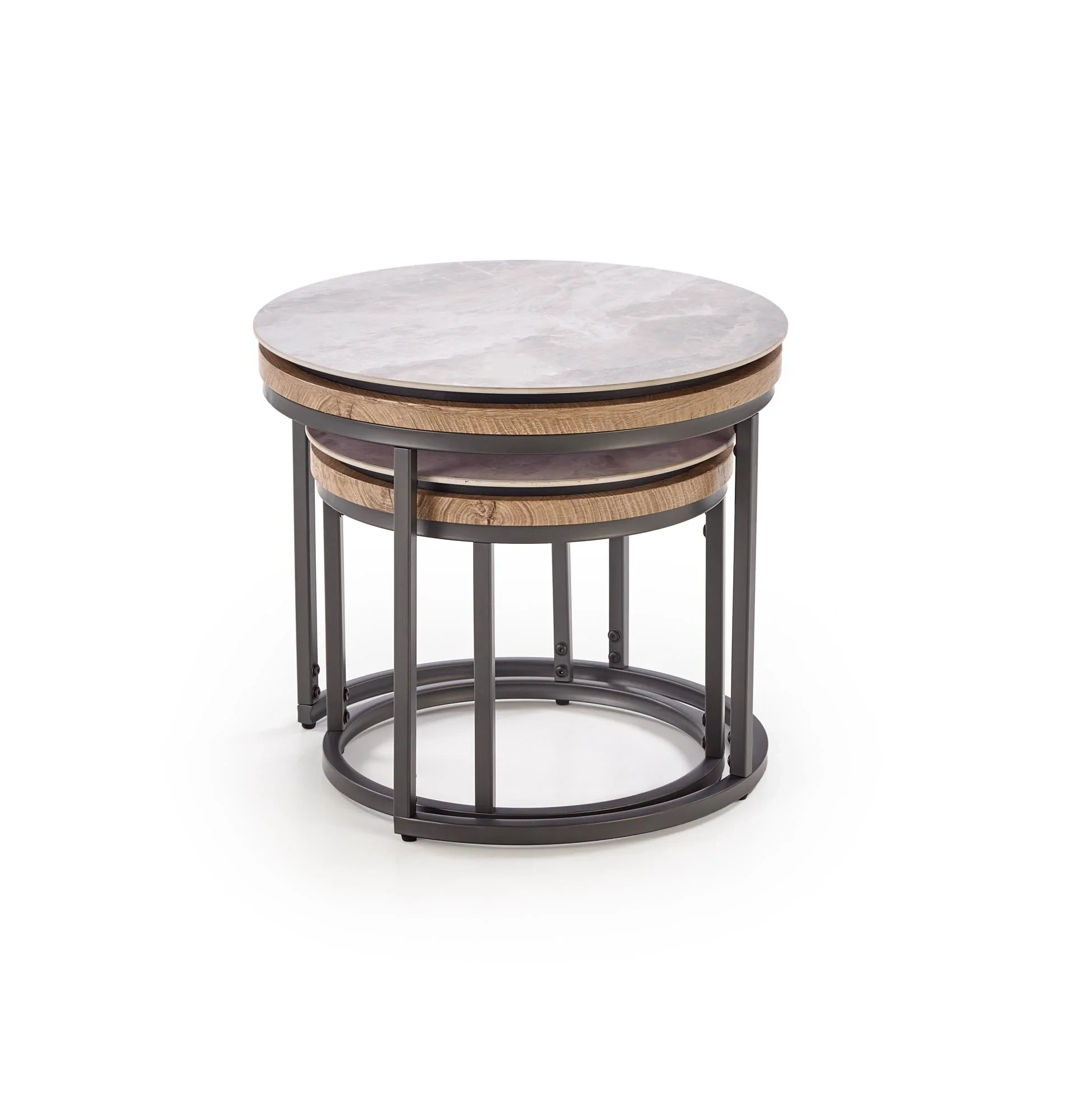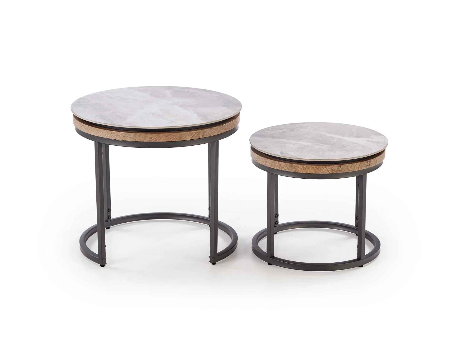 Dwa stoliki o różnych wymiarach można ustawić razem lub osobno, dopasowując je do aktualnych potrzeb. Solidne materiały i dopracowane detale sprawiają, że zestaw prezentuje się lekko, a jednocześnie stabilnie i nowocześnie.